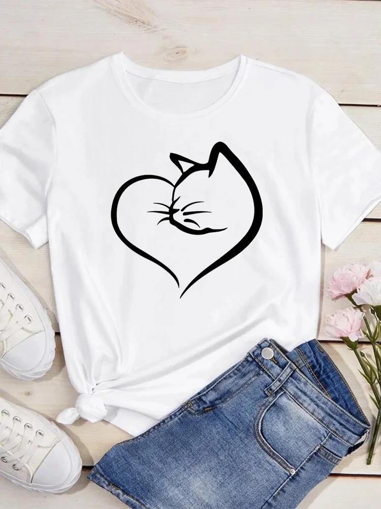 Новая симпатичная женская футболка с принтом в виде сердца и кошки, повседневный топ с коротким рукавом, летняя женская одежда, уличная одежда с рисунком из мультфильмов, одежда 2000 года