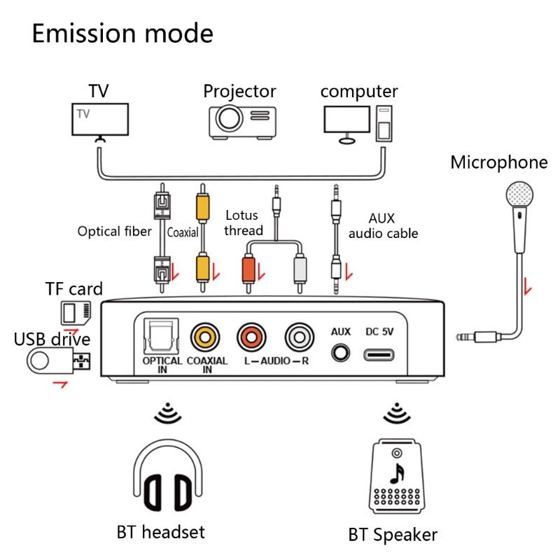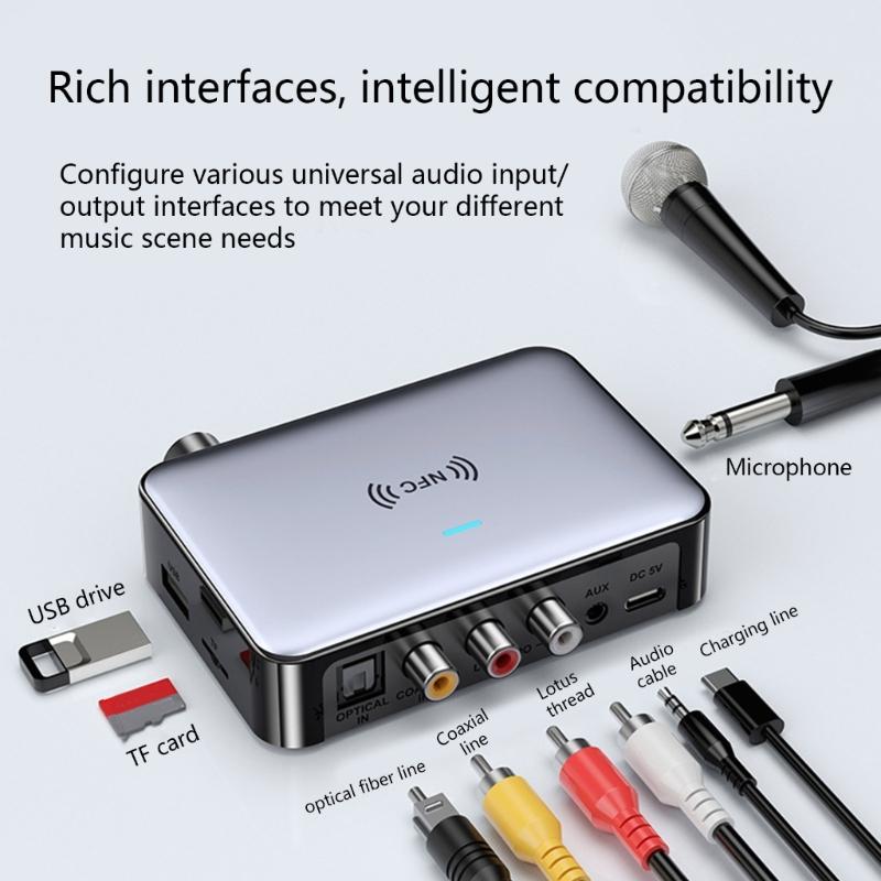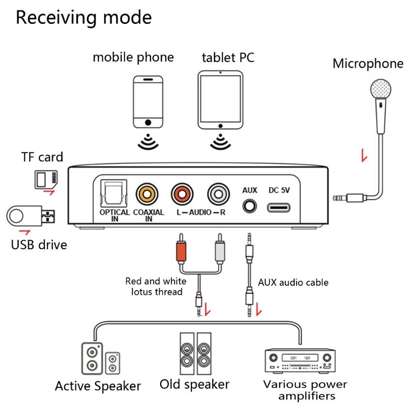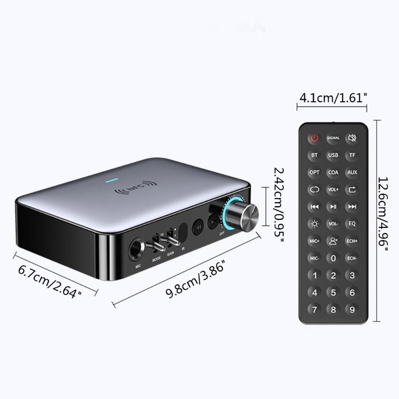 Ввод: 3,5 мм AUX + RCA + USB + TF карта + 6,5 мм микрофон + цифровое оптическое волокно + цифровой коаксиальный