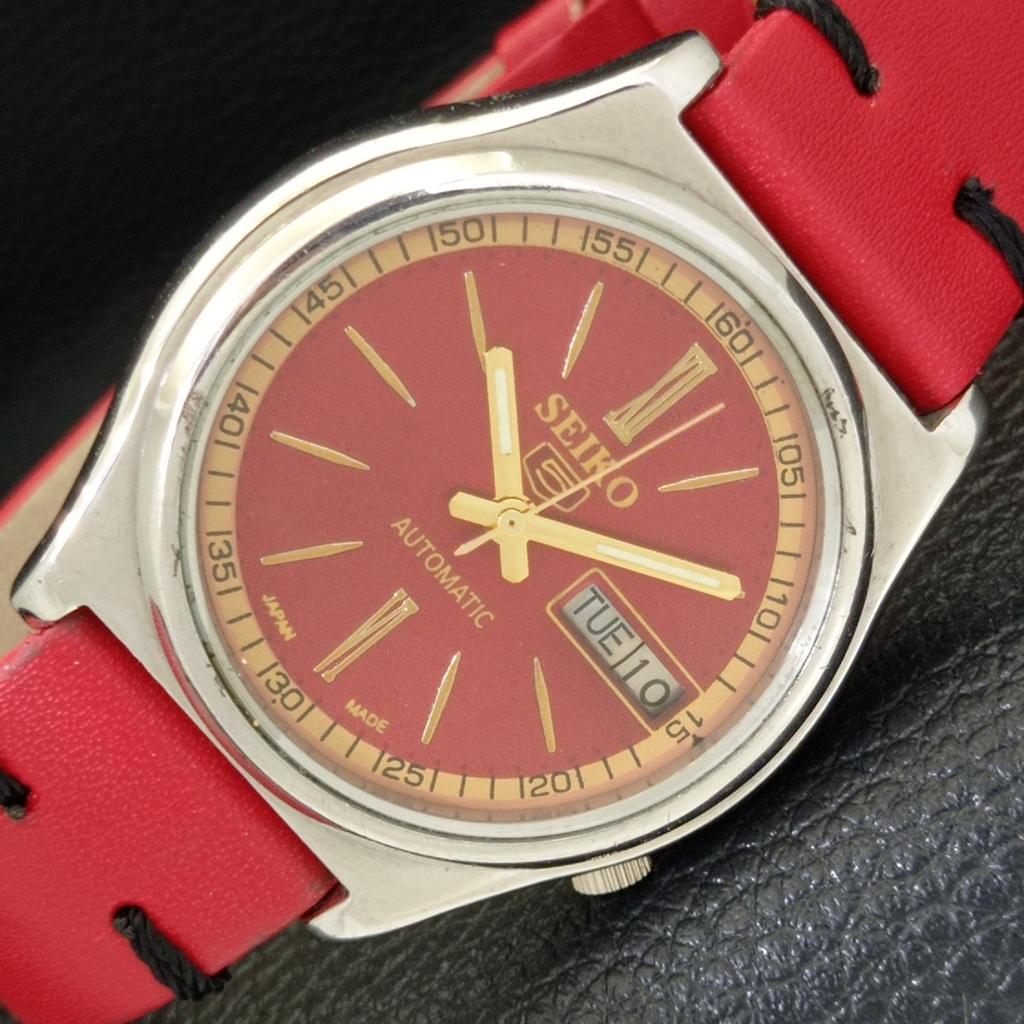 ПОДЕРЖАННЫЕ ВИНТАЖНЫЕ ЧАСЫ SEIKO 5 АВТОМАТИЧЕСКИЕ ЯПОНСКИЕ МУЖСКИЕ ЧАСЫ С ЦИФЕРБЛАТОМ КРАСНОГО ЦВЕТА a434949-2 R122-a434949