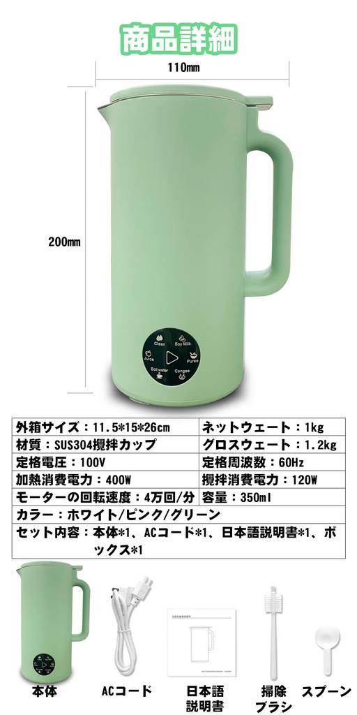 Размер тела: 8*11*20см Размер внешней коробки: 11,5*15*26см Вес нетто: 1 кг Вес брутто: 1,2 кг Материал: Чашка для перемешивания SUS304 Цвет: Белый/Розовый/Зеленый Содержимое набора: Корпус*1, шнур переменного тока*1, руководство на японском языке*1, коробка*1