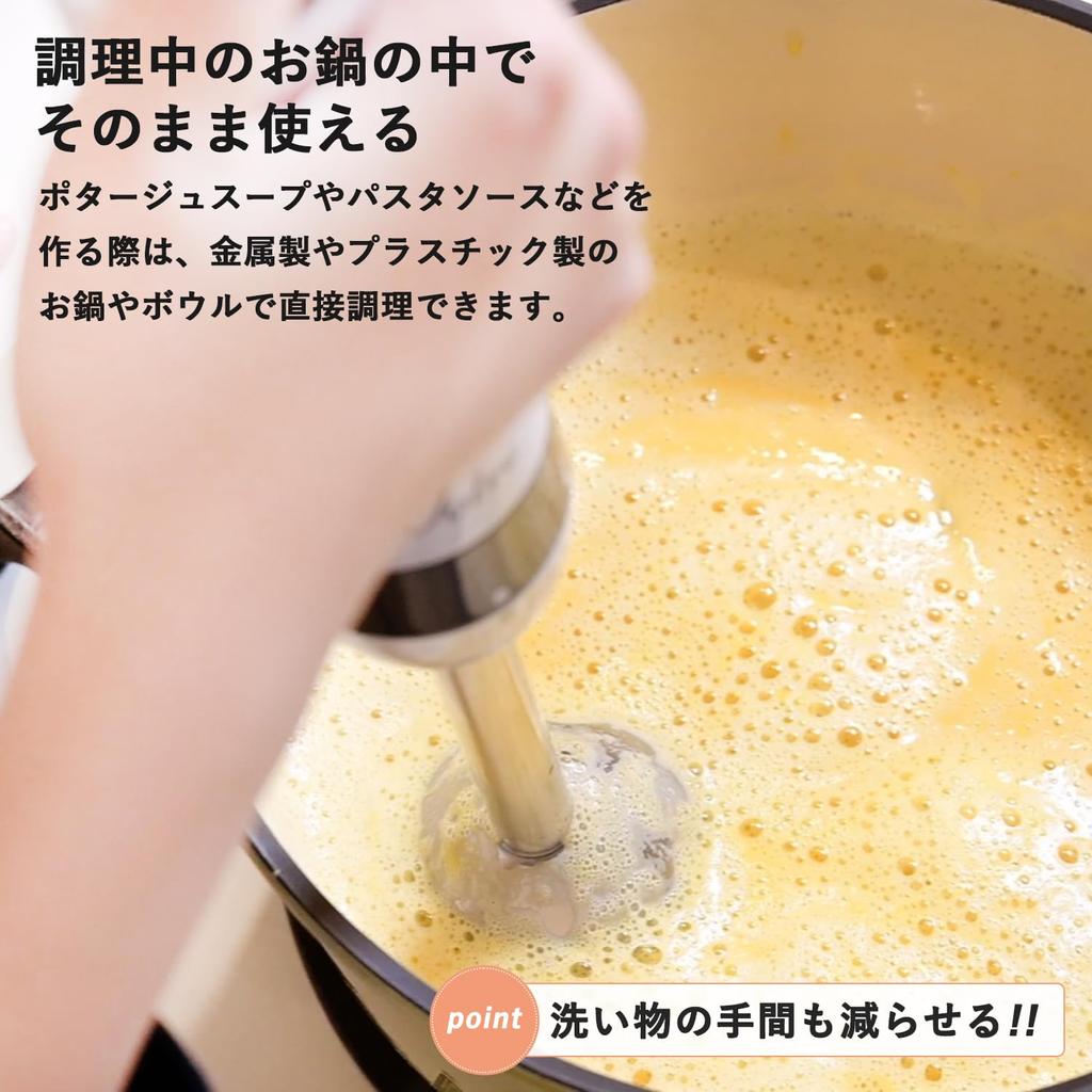 [Можно использовать непосредственно в кастрюле] При приготовлении супа-пюре или соуса для пасты вы можете готовить непосредственно в металлической или пластиковой кастрюле или миске, что сокращает хлопоты по мытью.. *Пожалуйста, не используйте бьющиеся предметы, такие как стекло или керамика, а также предметы, которые легко рвутся или деформируются, такие как пакеты или силикон.