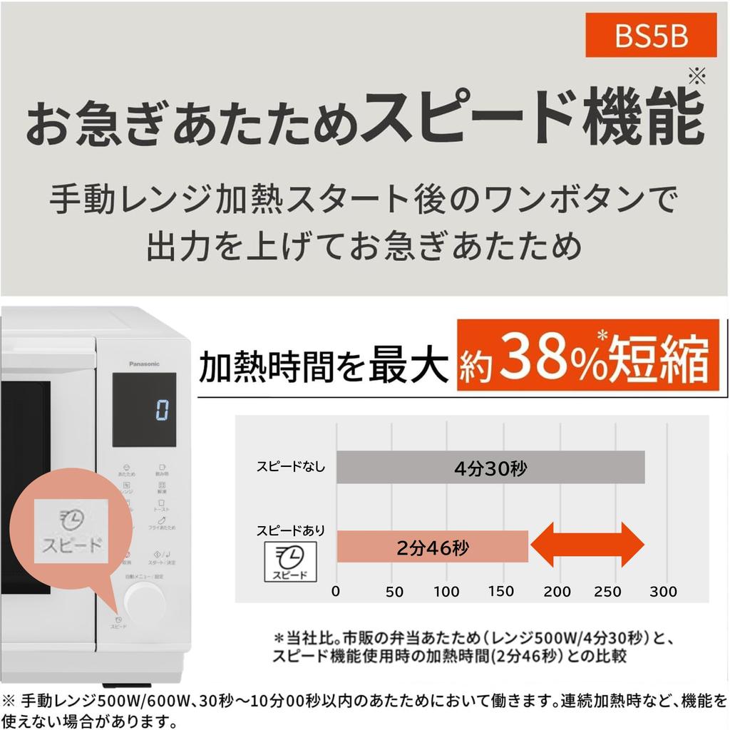 Сократите время нагрева до 38% (* 2) всего одной кнопкой после запуска. * 2: По сравнению с нашей компанией. Сравнение имеющихся в продаже разогревающих бенто (микроволновка 500 Вт/4 минуты 30 секунд) и время нагрева при использовании функции скорости (2 минуты 46 секунд)