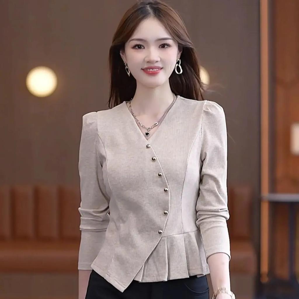 Женская одежда мода оборка V-образный вырез узкая асимметричная футболка офисная женская элегантная шикарная однотонная с длинным рукавом топы для поездок на работу