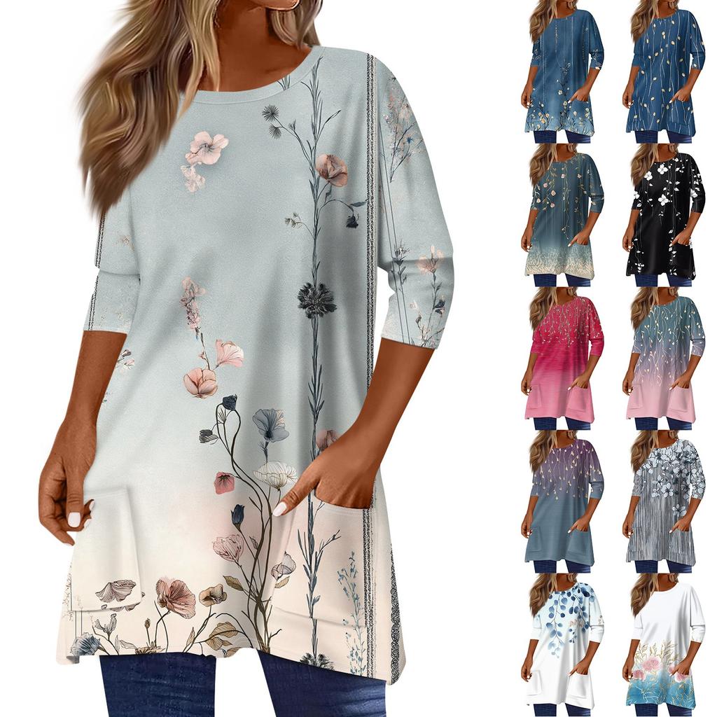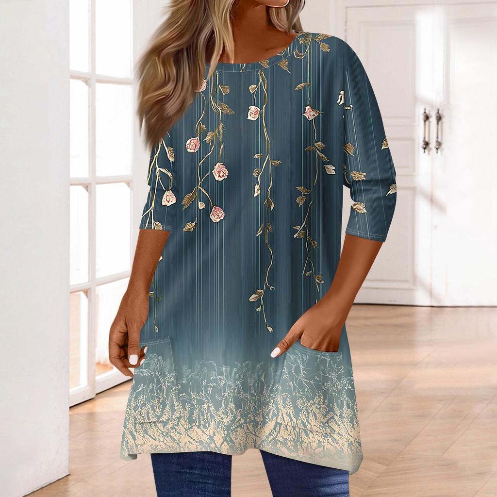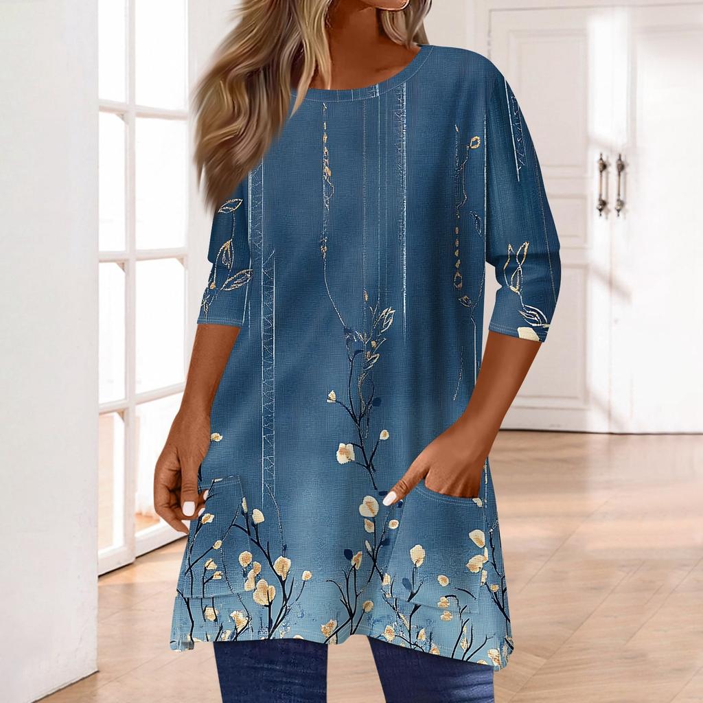 3/4 рукава кармана топы для женщин футболка повседневный принт средней длины топы футболка круглый вырез пуловер блузка
