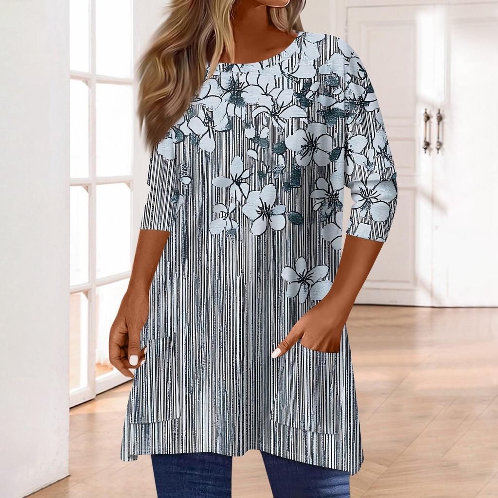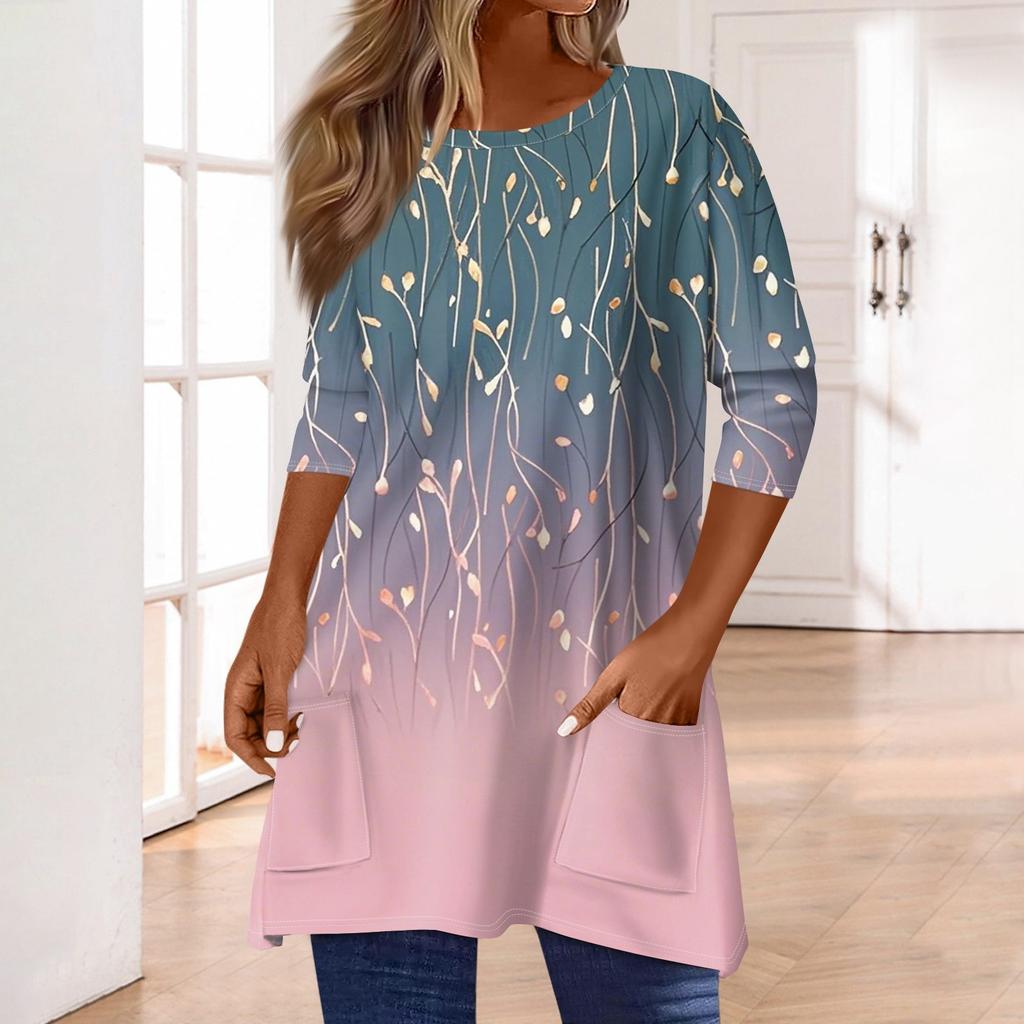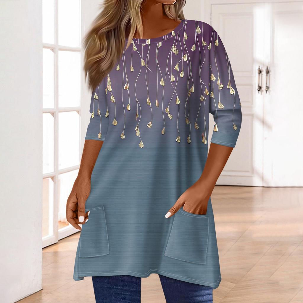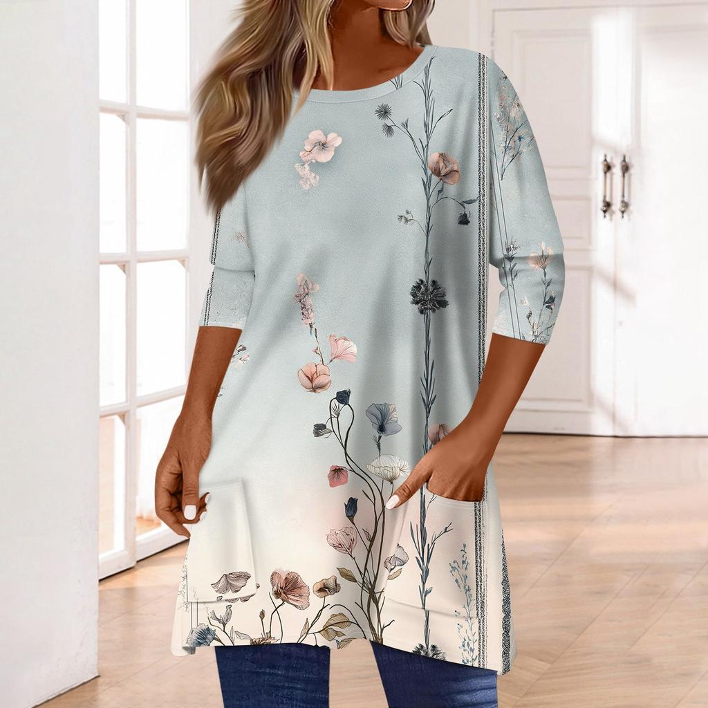 3/4 рукава кармана топы для женщин футболка повседневный принт средней длины топы футболка круглый вырез пуловер блузка