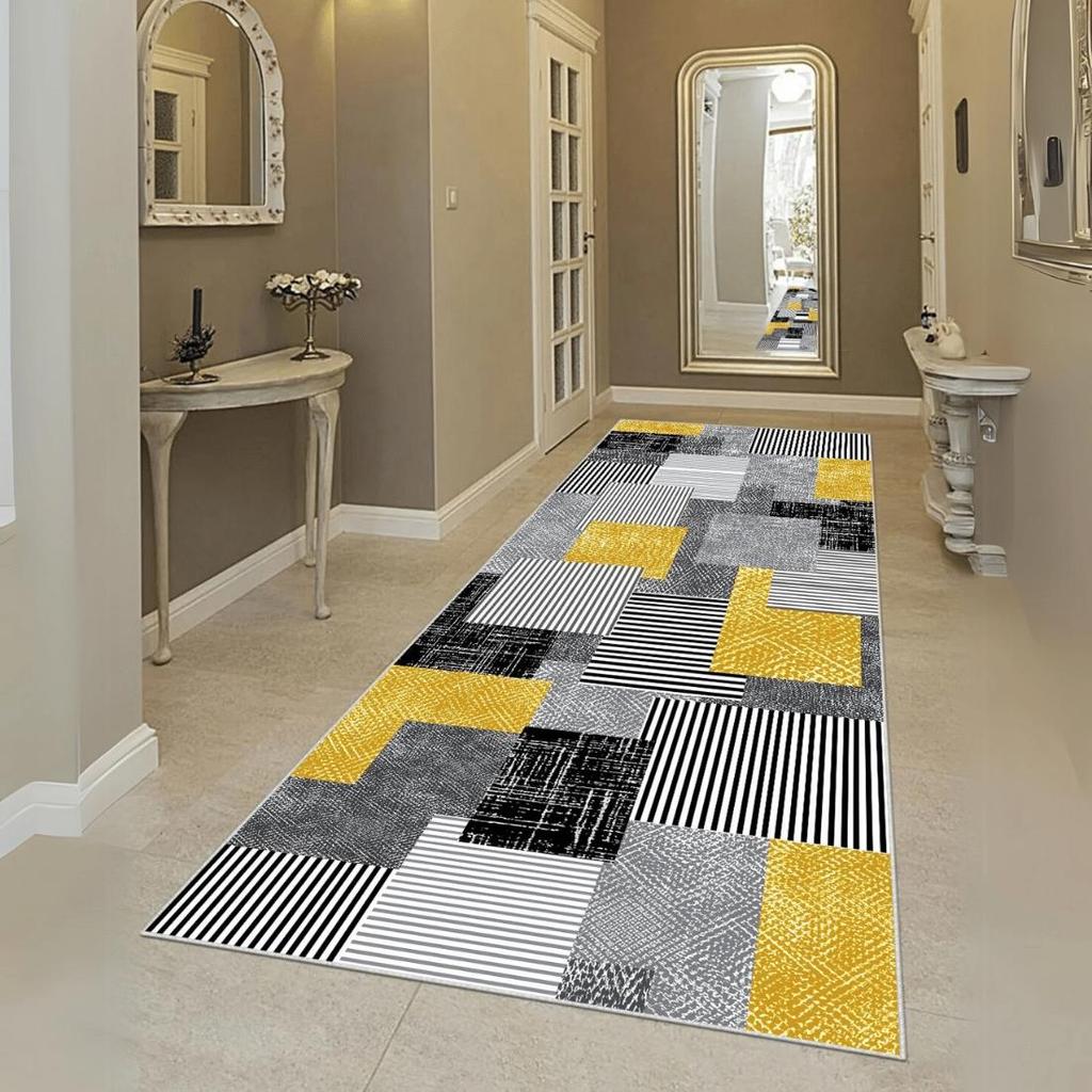 Bu yolluk halı, modern bir tasarıma sahip olup, sarı, gri, siyah ve beyaz renklerini barındırır. Geometrik desenleri, halıya dinamik bir görünüm katmaktadır. Kaymaz tabanı sayesinde güvenli bir kullanım sunar.