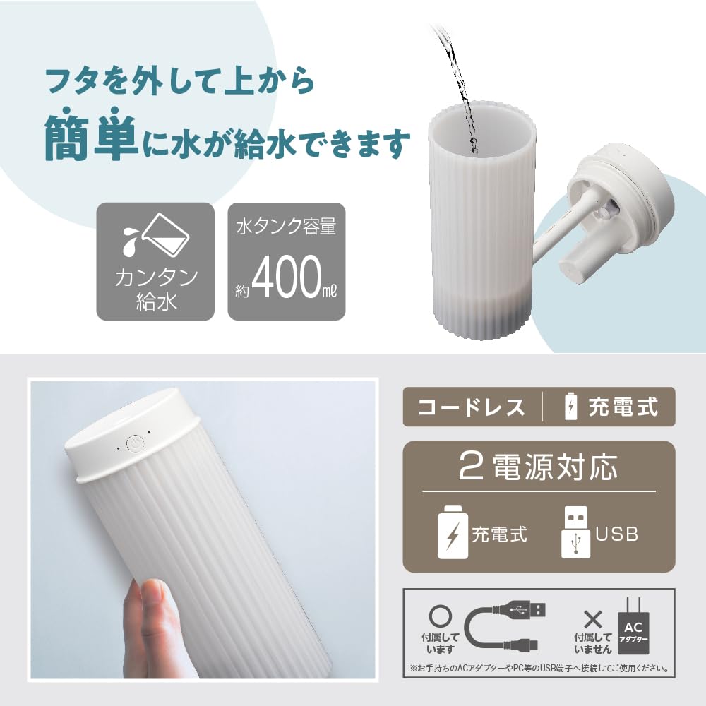 Время зарядки: Примерно 5 часов, Время использования: Операция USB (8 часов), Работа от аккумуляторной батареи (4 часа), Эффективность увлажнения: 50 мл в час, Емкость резервуара для воды: 400мл