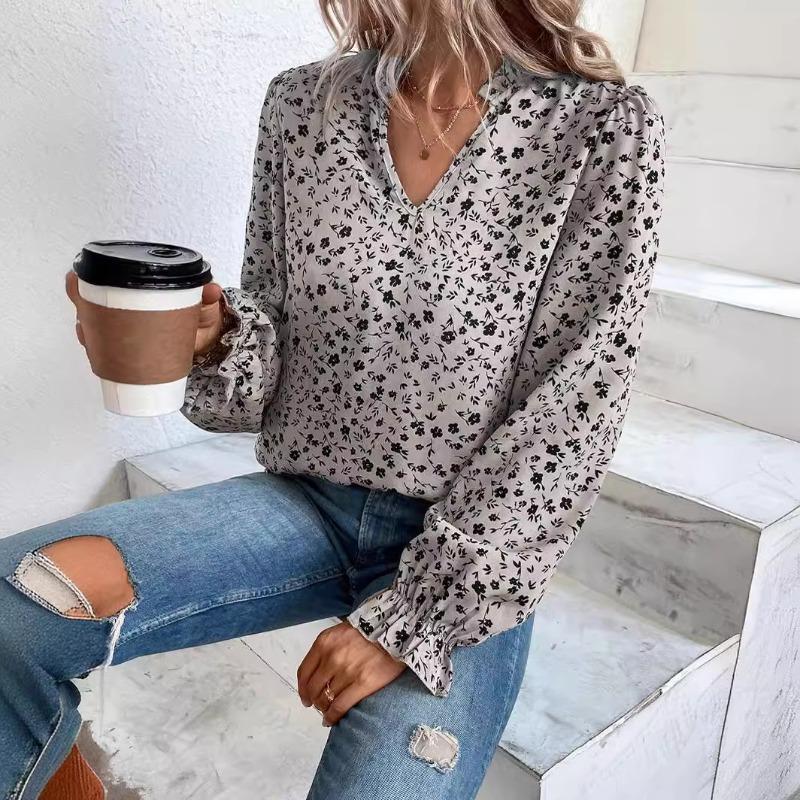 Осенний женский цветочный пуловер с V-образным вырезом, оборками, милой длинной рукавом, напечатанной рубашкой