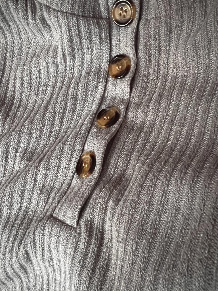 Комфортный лонгслив ☺️ Материал: смесь полиэстера и эластана. Мягонькая и приятная к телу ткань. Вязка совсем тоненькая, в глаза не бросается. У меня размер М. Хорошо сел на грудь 84 см. Моей маме с грудью 93 см кофточка тоже в пору, но чуть больше по фигуре. Рукав хорошей длины. Пуговицы на груди полностью функциональны.