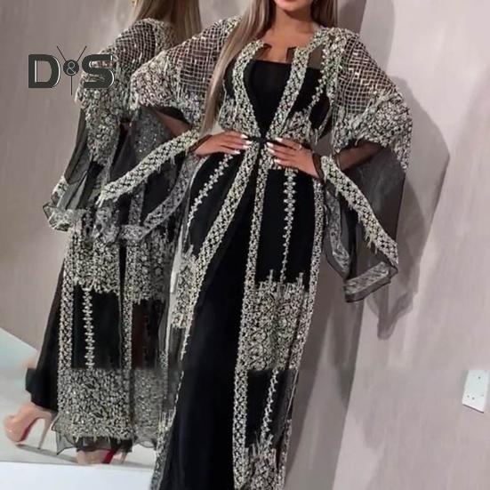 Привлекательный бронзовый дизайн: Это платье, состоящее из сексуального длинного платья и шали с блестящими бронзовыми деталями, очаровывает своим привлекательным и привлекающим внимание бронзовым ансамблем во всю длину.