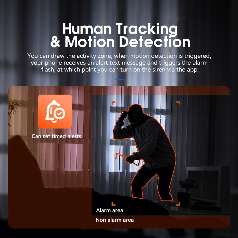 Support human tracking, mobile tracking function, when someone is detected entering the monitoring screen, the camera automatically rotates with the person