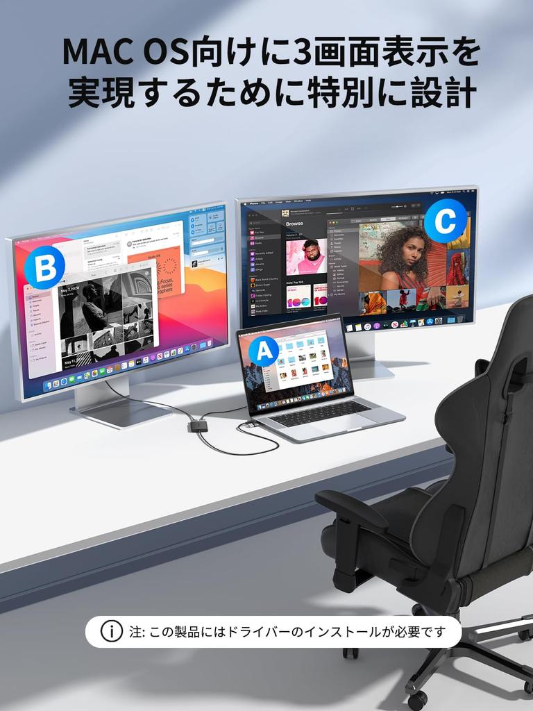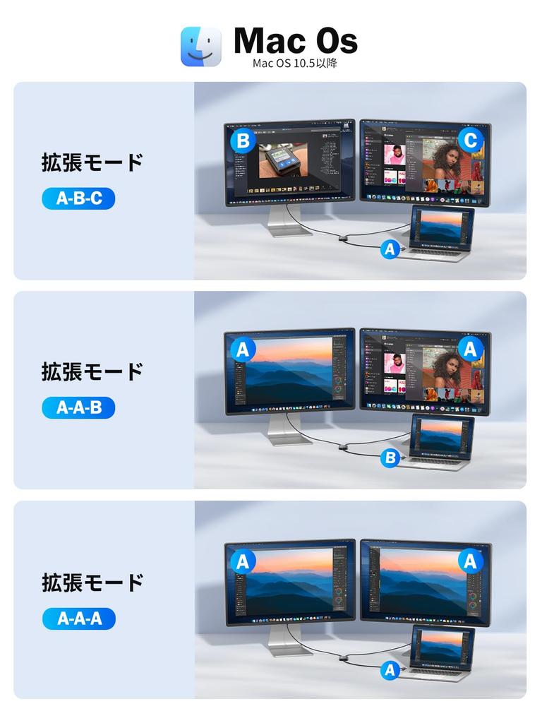 [В MAC OS/Windows OS поддерживаются 3 различных экрана] В предыдущих версиях Mac OS дублировать один и тот же экран можно было только в расширенном режиме, но не было функции вывода трех различных экранов.. Однако этот двойной адаптер-преобразователь HDMI (модель: HD10) оснащен инновационной технологией, позволяющей выводить изображение на три разных экрана независимо даже в расширенном режиме Mac OS. MacOS поддерживает режимы AAA и ABC. Windows поддерживает режимы AAA, AAB, ABB, ABC 4. Поддерживает только разрешения до 1920x1080@60Гц для Windows 11, Windows 10, Mac OS 10.15 и более поздних версий.. уведомление: ① Требуется установка драйвера "Udisplay". ②ChromeOS, Android, iOS, Linux и Unix не поддерживаются.