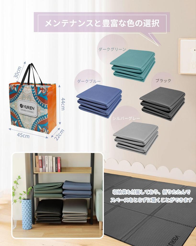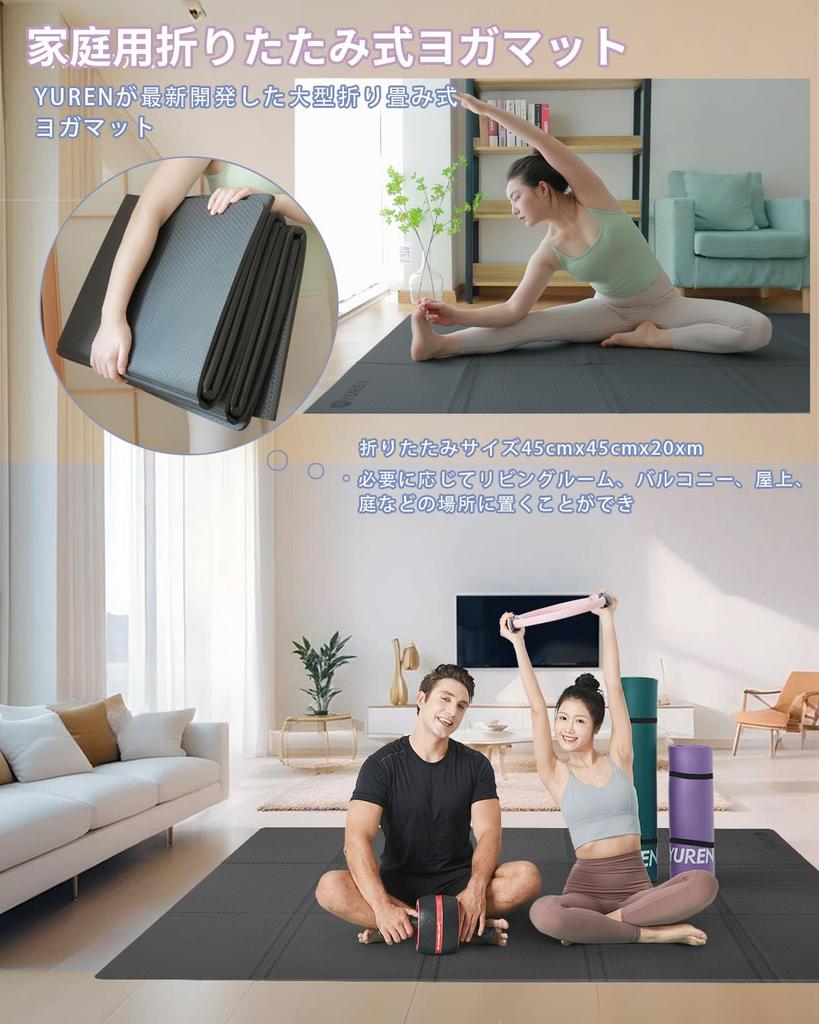 1. Складной коврик для йоги для домашнего использования: Новейшая разработка YUREN — большой складной коврик для йоги, размер изделия 130 см x 200 см, размер в сложенном виде 45 см x 45 см x 20 см.. Его можно разместить в гостиной, на балконе, на крыше, в саду и других местах по вашему желанию. В комплект также входит сумка для хранения, которую можно сложить и убрать, не занимая места.