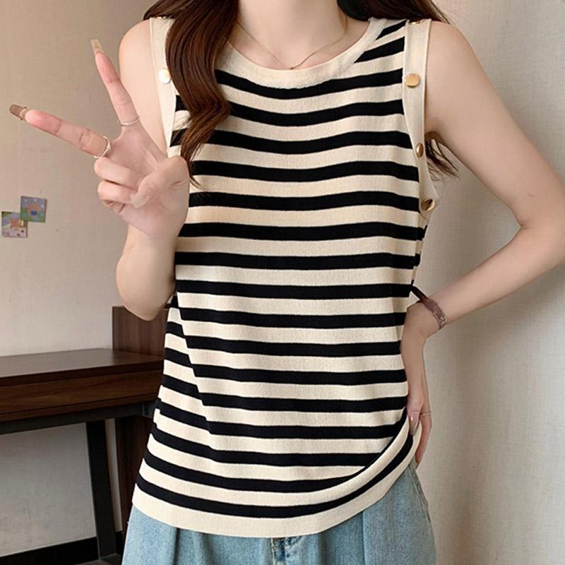 Майки женские летние 2025 года без рукавов с круглым вырезом черные полосатые трикотажные тонкие майки женские топы JJ228