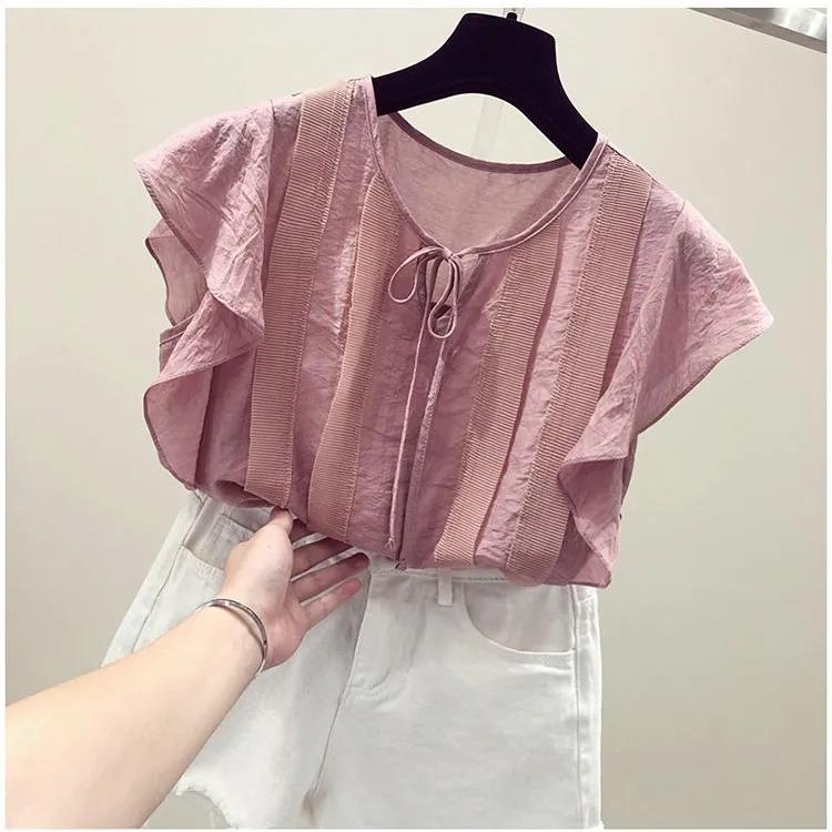 Женская летняя однотонная свежая свободная шифоновая рубашка с коротким рукавом, простой топ с оборками и завязками