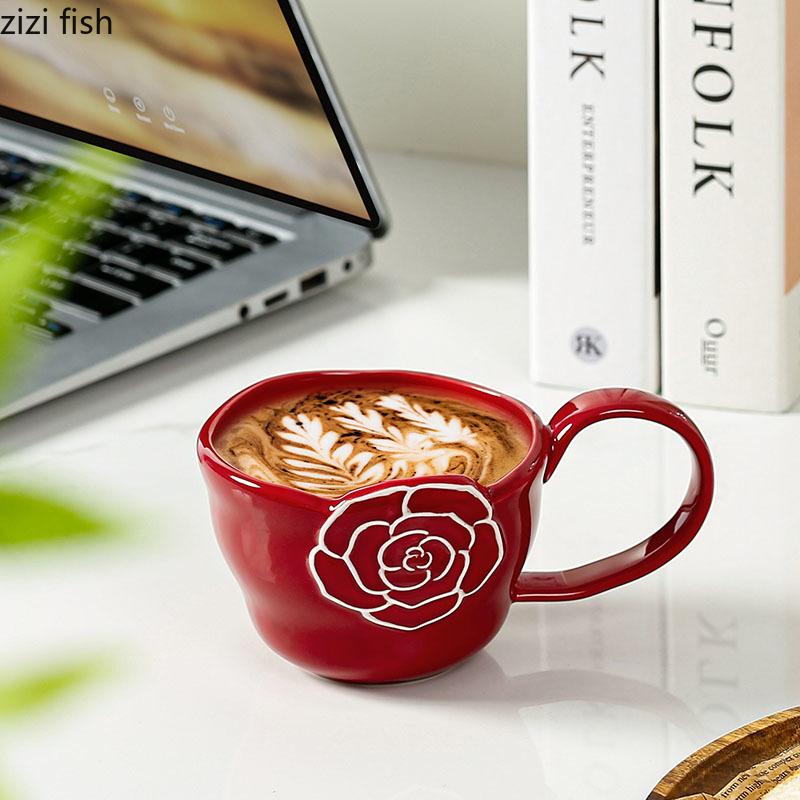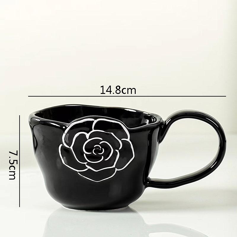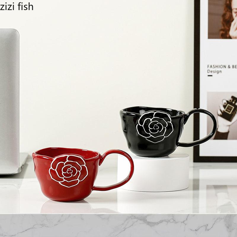 Простота Керамическая рельефная кружка с цветком Креативная большая ручка Кружка для кофе Цветочная чашка для чая Красивая бытовая чашка для воды Пара чашек
