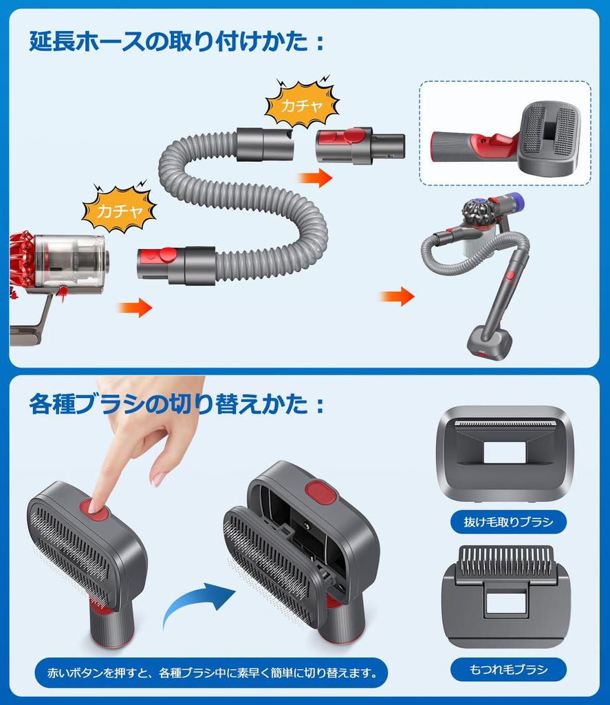 [Совместимые модели]: Можно использовать с беспроводными пылесосами Dyson V7, Dyson V8, Dyson Cyclone V10, Dyson V11, Dyson Digital Slim, Dyson V12 Detect Slim, Dyson V15 Detect. Подсоедините с помощью удлинительного шланга и переходника, входящих в комплект для ухода за домашними животными.. *Обратите внимание, что другие модели несовместимы.