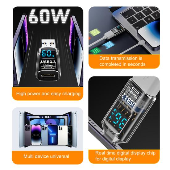 Испытайте молниеносную скорость передачи данных с этим высококачественным адаптером, демонстрирующим замечательную скорость передачи данных 10 Гбит/с.. Легко и просто передавайте видео и файлы, гарантируя бесперебойное подключение. Этот универсальный адаптер поддерживает зарядку высокой мощности 60 Вт, что обеспечивает быструю и эффективную зарядку, а также быструю передачу данных за считанные секунды..