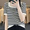 Женские свитеры пуловеры 2025 лето короткий рукав квадратный вырез полосатый черный вязаный свитер женские топы пуловер JJ254