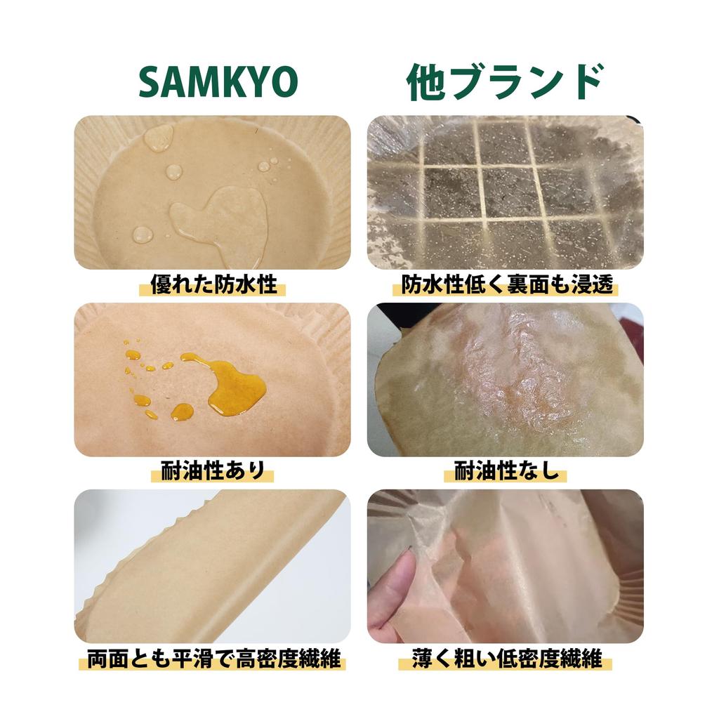 [Водо-, масло- и термостойкая] Бумага для фритюрницы должна обладать высокой термостойкостью, водостойкостью и маслостойкостью.. Бумага для фритюрницы SAMKYO выдерживает температуру до 220 градусов по Цельсию, не ограничивает циркуляцию горячего воздуха внутри фритюрницы и не увеличивает значительно время приготовления.