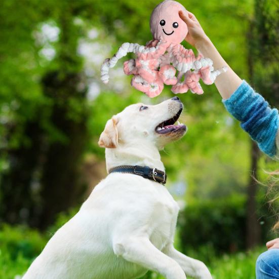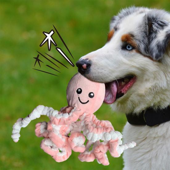 Водонепроницаемый слой внутри предотвращает попадание слюны в плюшевый хлопок, обеспечивая гигиеничность и долговечность.. Уникальные эластичные ножки игрушки напоминают осьминога, обеспечивая вашему питомцу максимальное удовольствие от перетягивания каната.. Идеально подходит для любителей агрессивного жевания, пищащий эффект добавляет азарта игре, привлекая внимание вашего питомца.