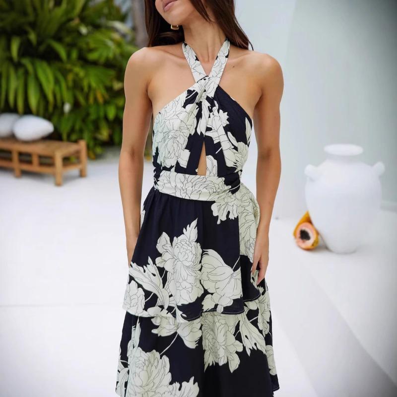 2025 Весна Лето Цветочный Принт Длинный Многослойный Платье Женщин Элегантный Без Рукавов С Открытой Спиной Шнуровка Миди Торт Платье Корейский Стиль Винтажные Платья Для Вечеринок