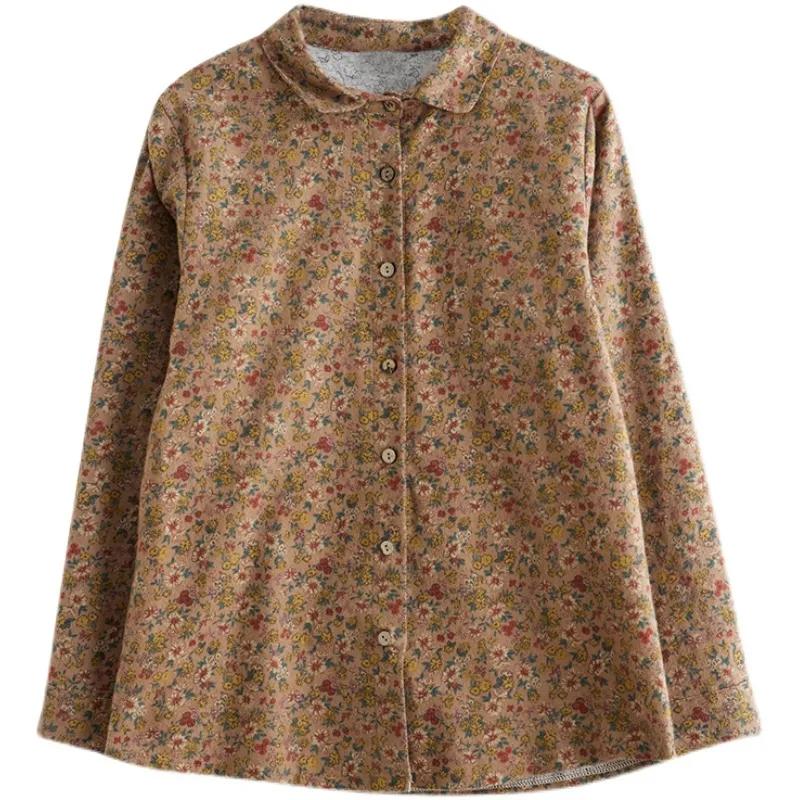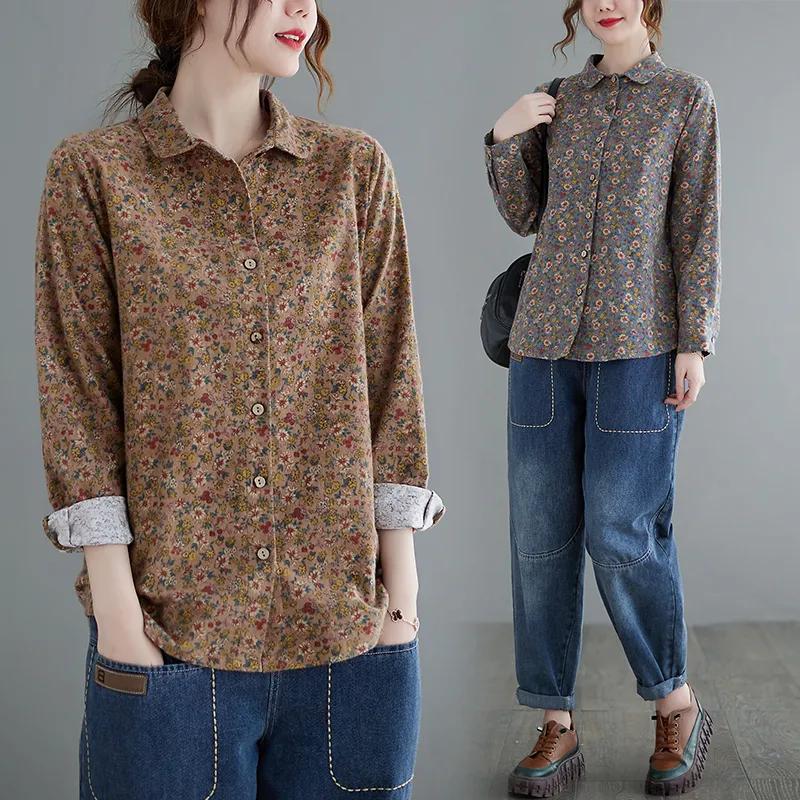 Женская весенняя рубашка с длинным рукавом и цветочным принтом на пуговицах. Удобные топы из хлопка и льна.