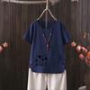 Футболка из хлопка и конопли с V-образным вырезом и принтом «Нордический одуванчик» для женщин — лето 2025 г., повседневная и удобная