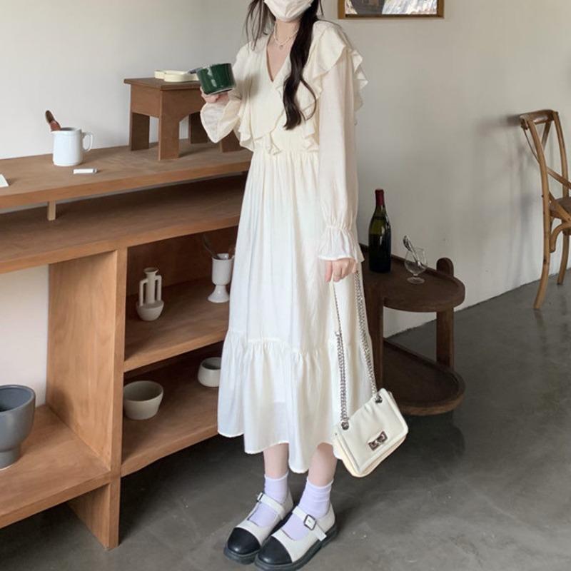Женское нежное платье с V-образным вырезом, оборками, длинными рукавами, французский темперамент с базовым платьем — купить товар онлайн с бесплатной доставкой по всему миру!