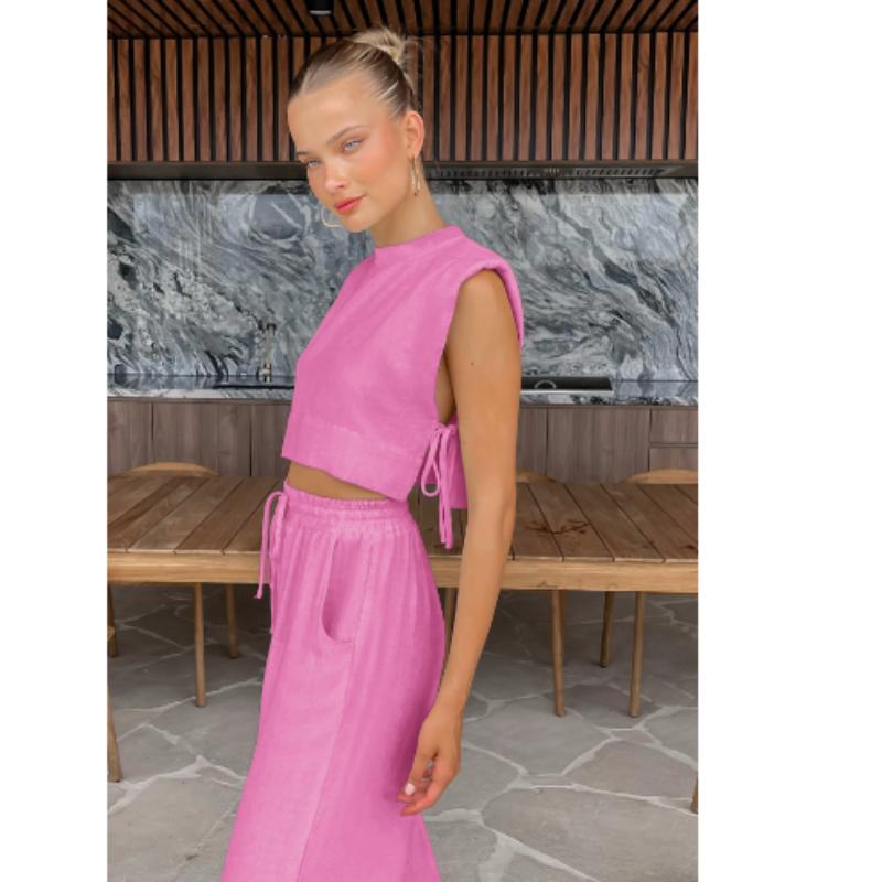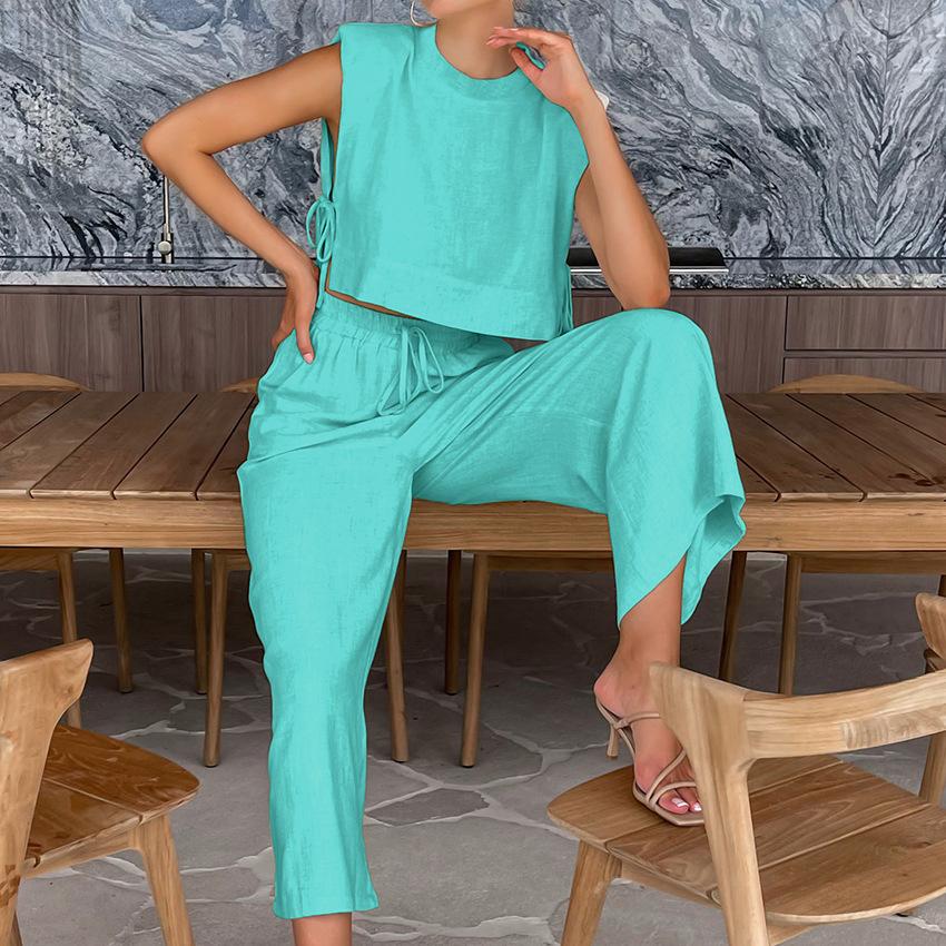 Весенне-летний женский праздничный комплект из льняных брюк, укороченный топ, однотонная одежда, комплект из 2 предметов для женщин