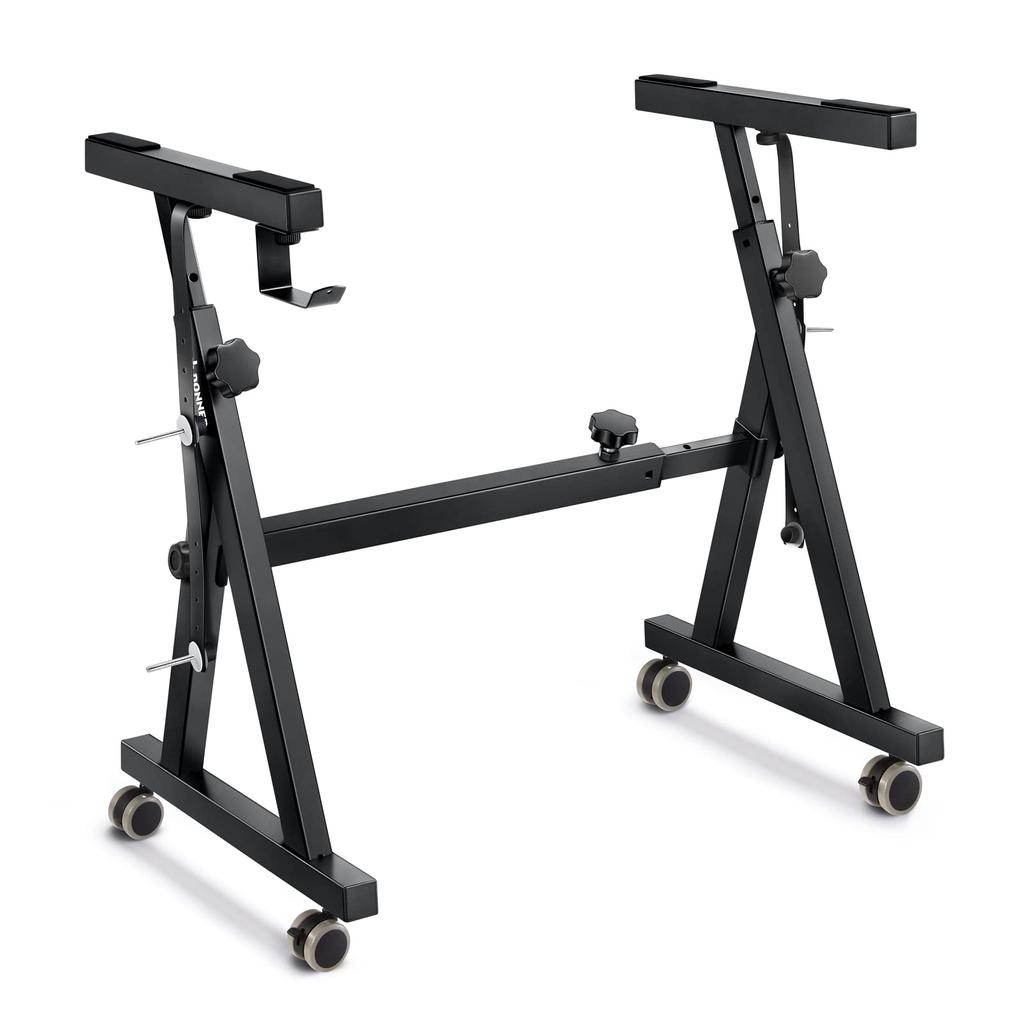 [С поворотными роликами] Оснащена 4 прочными поворотными роликами, вы можете легко перемещать подставку для клавиатуры. Если вам не нужно его перемещать, вы можете заменить прилагаемый коврик, чтобы он оставался на месте.. Инструменты не требуются, простая замена по видеоинструкции на странице. (уведомление: После установки цифрового пианино не забудьте заблокировать поворотные ролики, чтобы избежать случайных повреждений.)
