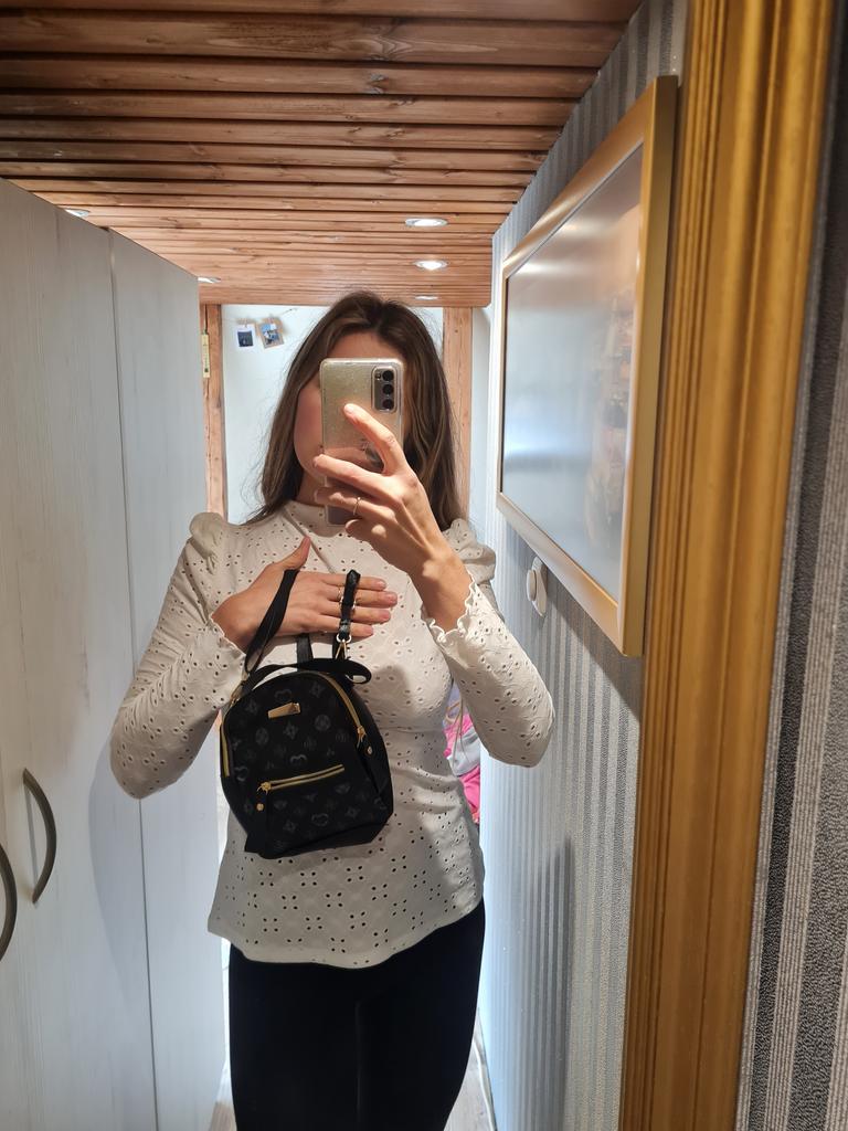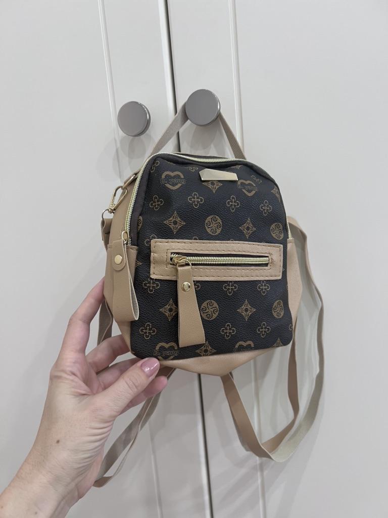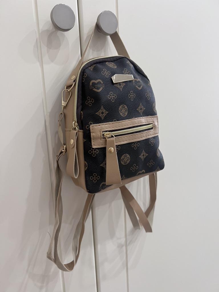Милый маленький рюкзак 🎒 под известный бренд Карман снаружи обманка Много не положить ,самое необходимое (телефон,ключи,деньги ,всякое мелкое ) Сделан из ПУ кожи Средней плотности,специфического запаха не имеет Доставили за две недели