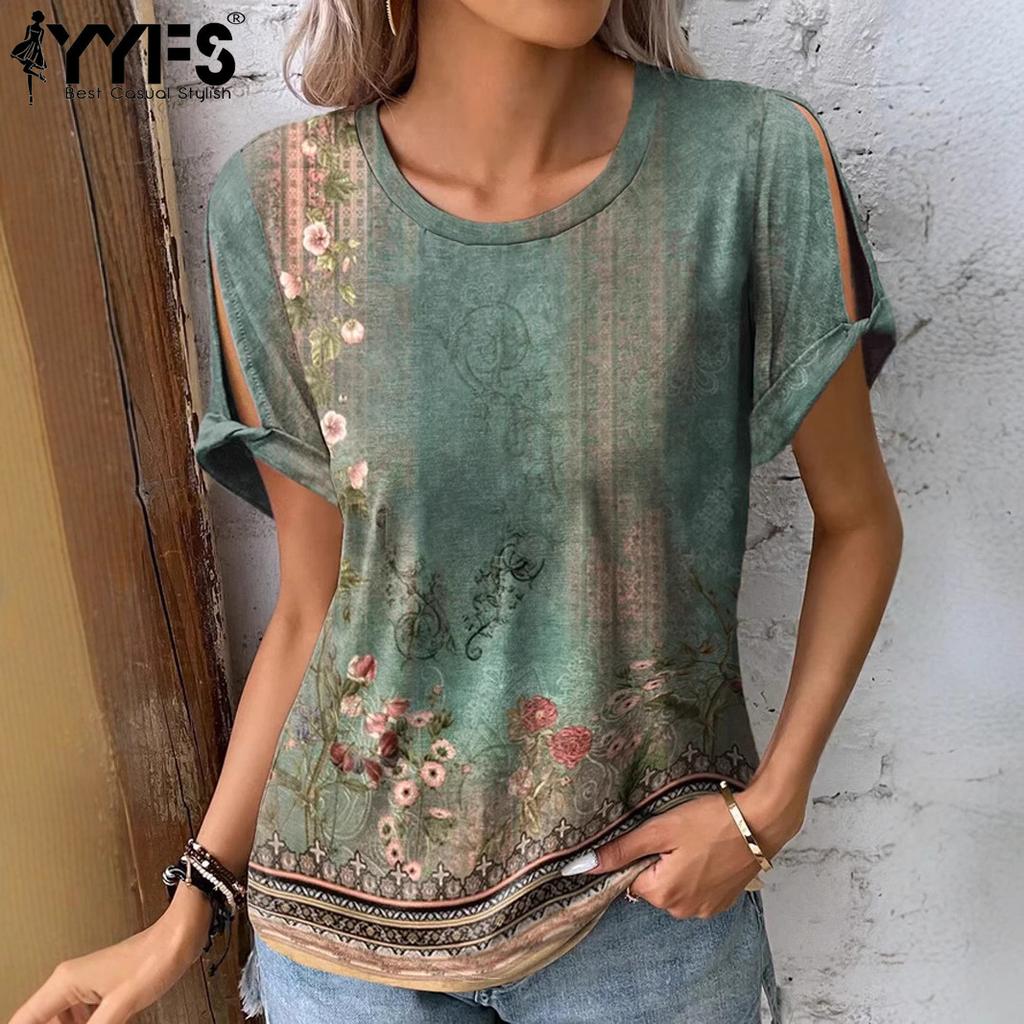 YYFS Женские модные повседневные летние весенние блузки и рубашки с цветочным узором и коротким рукавом с круглым вырезом
