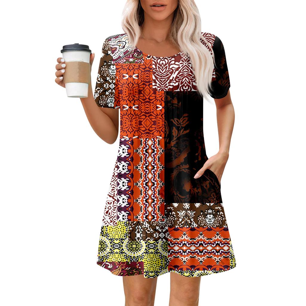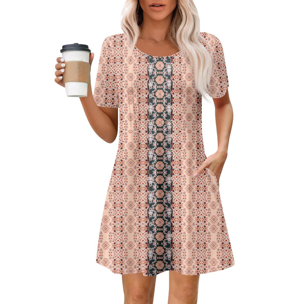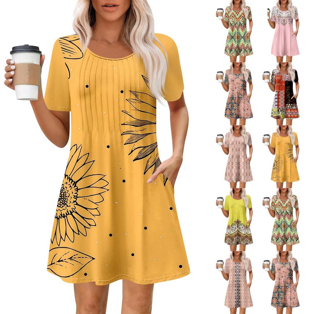 Женское летнее платье свободного покроя для пляжного отдыха, сарафан с коротким рукавом и круглым вырезом, с карманом, с коротким рукавом, платье-рубашка