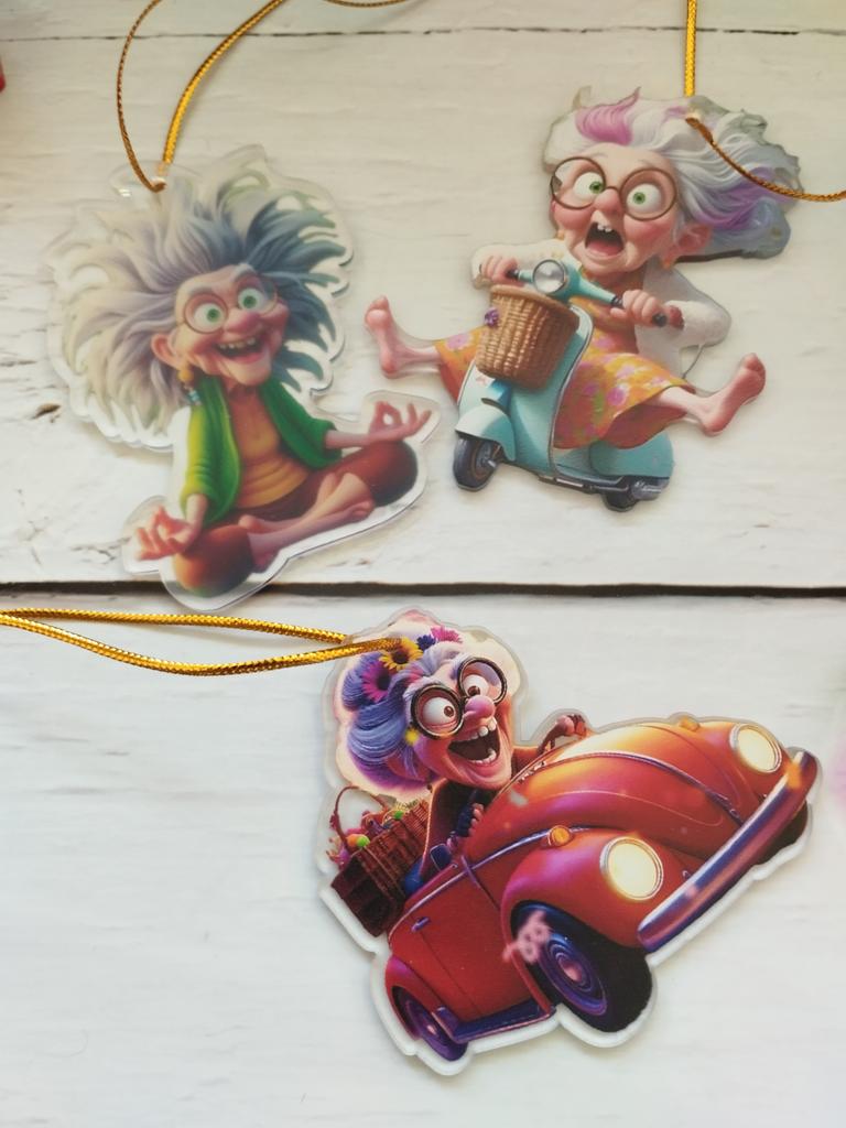🔥🔥🔥Акриловые подвески в автомобиль из коллекции "Очаровательная бабушка". Заказала по просьбе подруги. Очень прикольные, симпатичные и яркие картинки 😁. Все от одного продавца, но пришли в разных посылках. Все со шнурочком золотистого цвета. Выполнены с юмором 👍, однозначно рекомендую😊 🍀.