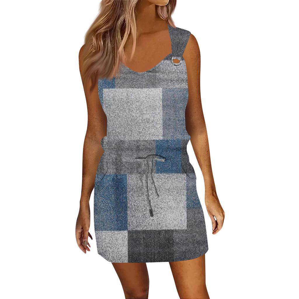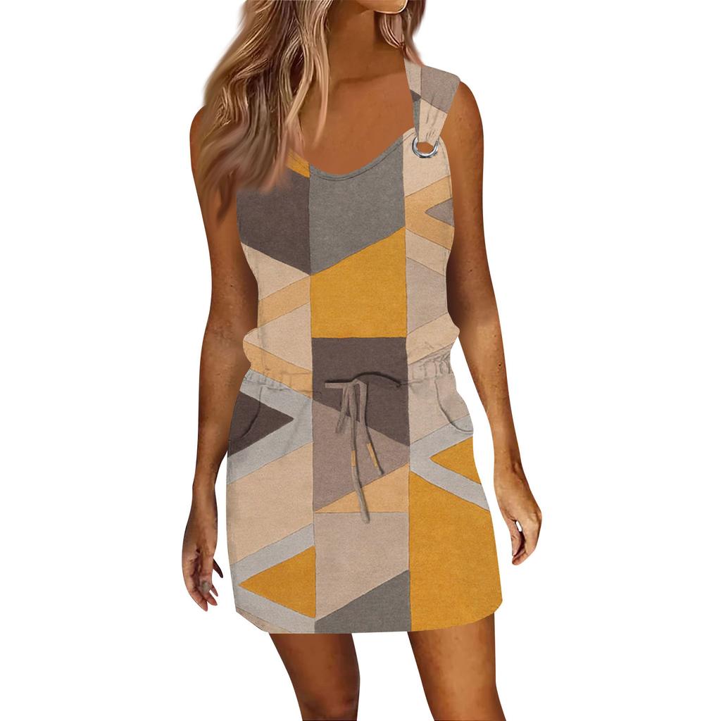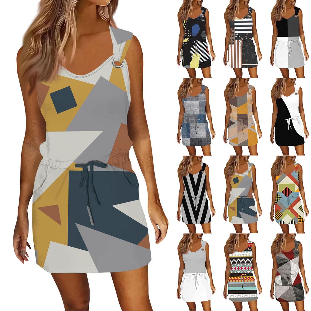 Женское модное повседневное платье без рукавов с принтом и завязками на шнурке с карманами