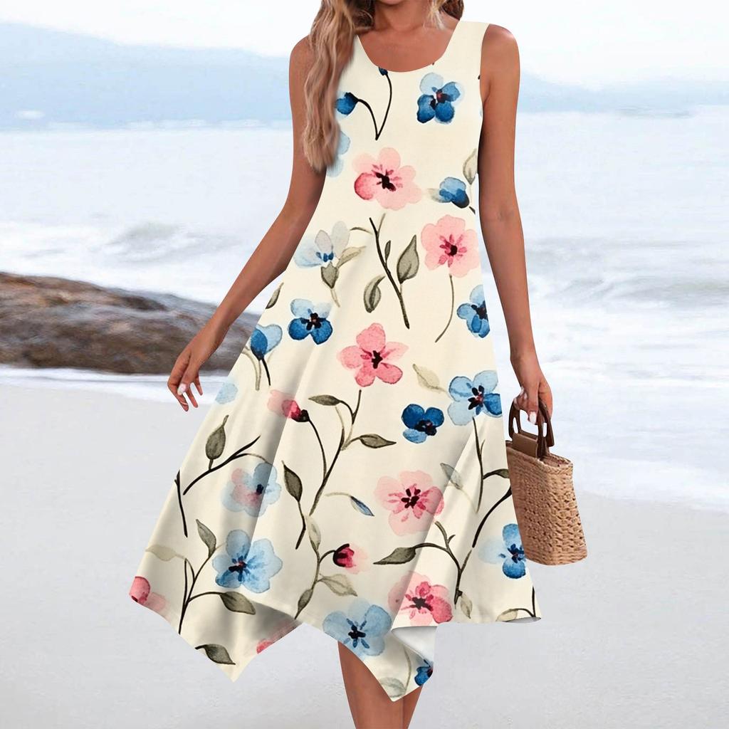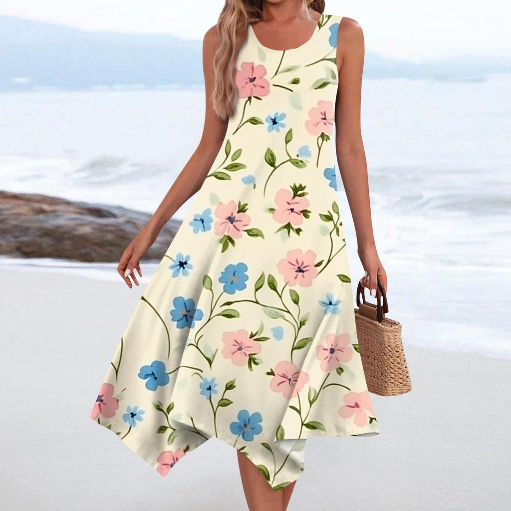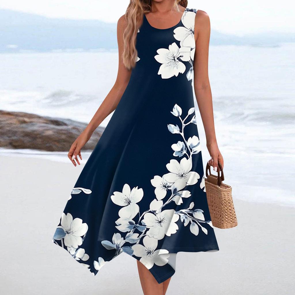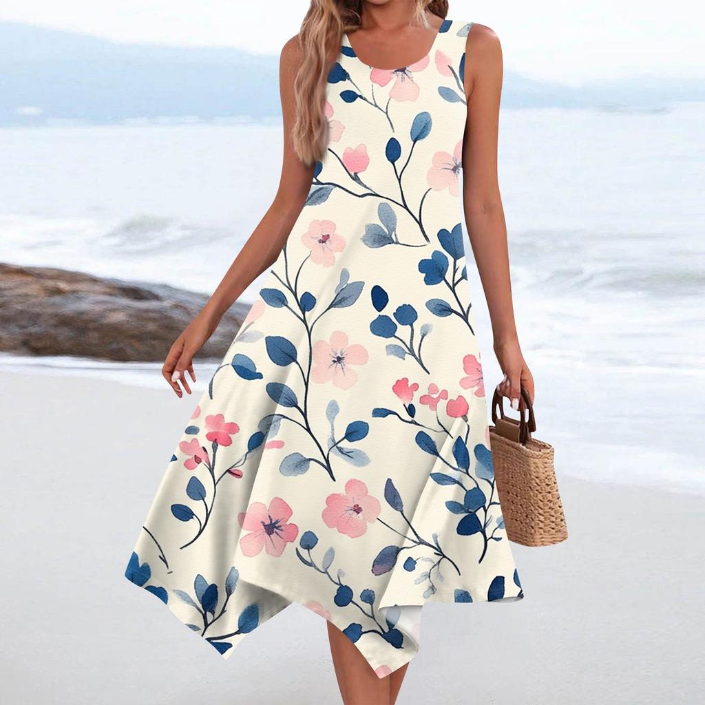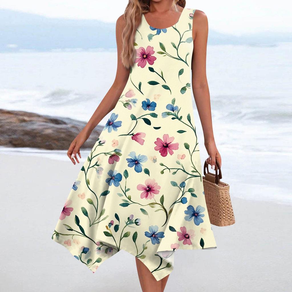 Женское повседневное модное платье средней длины с круглым вырезом без рукавов с винтажным цветочным принтом и неровным подолом