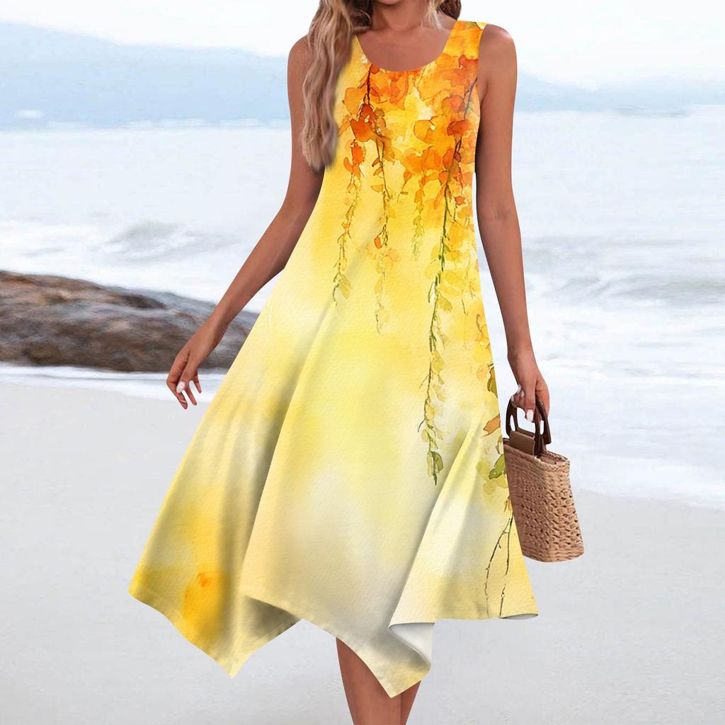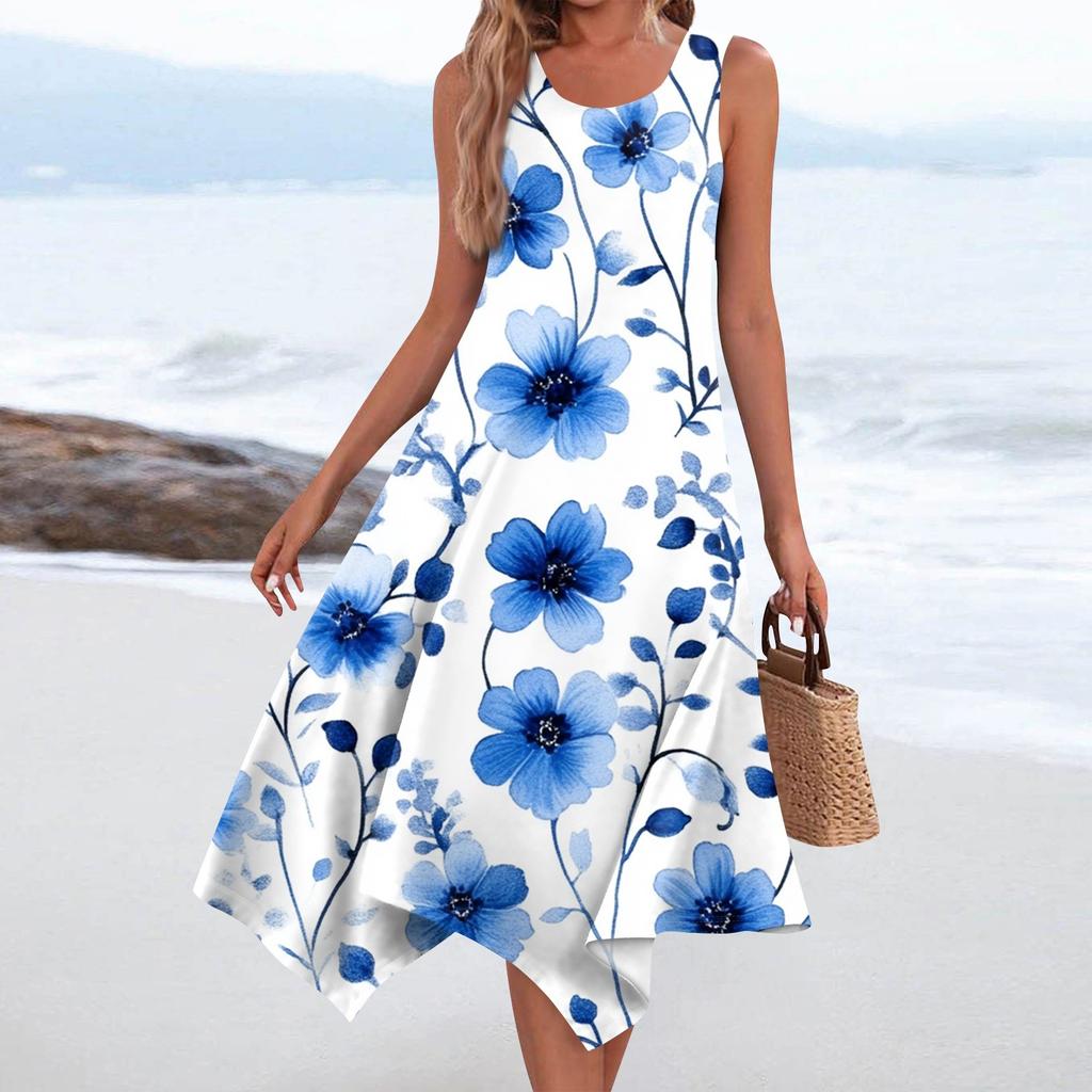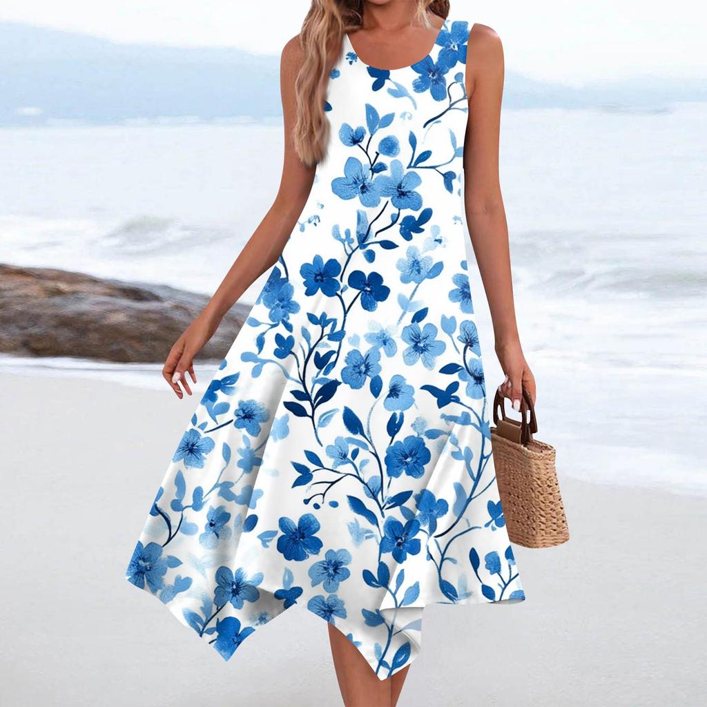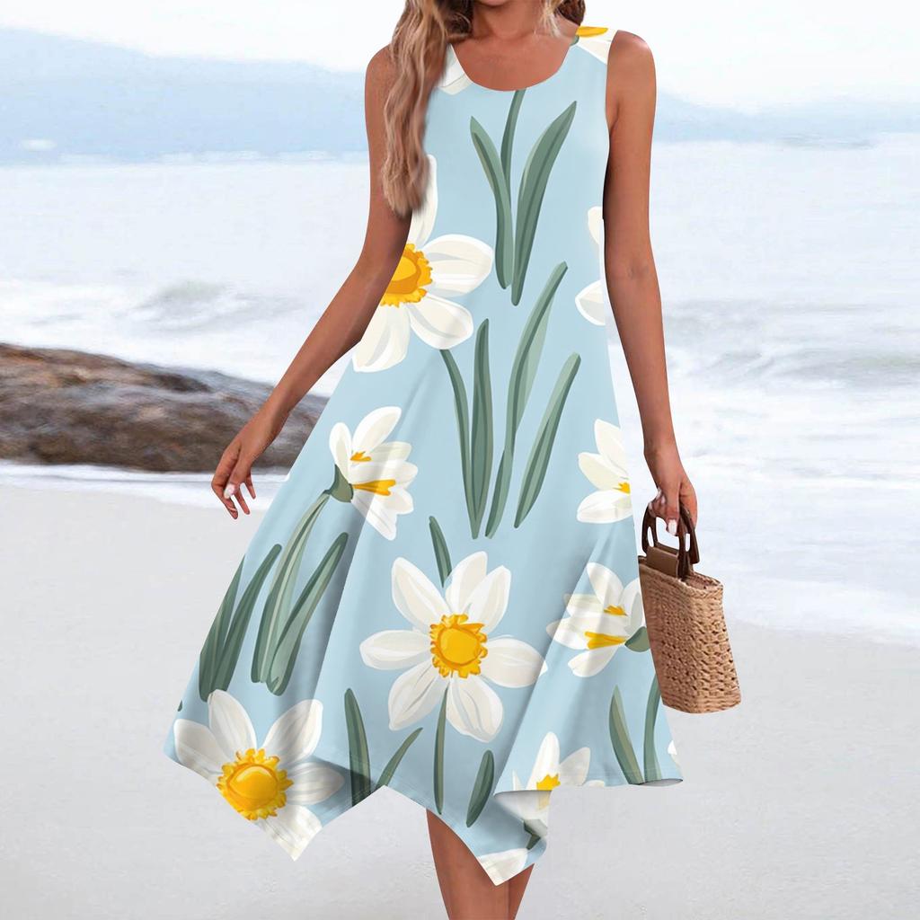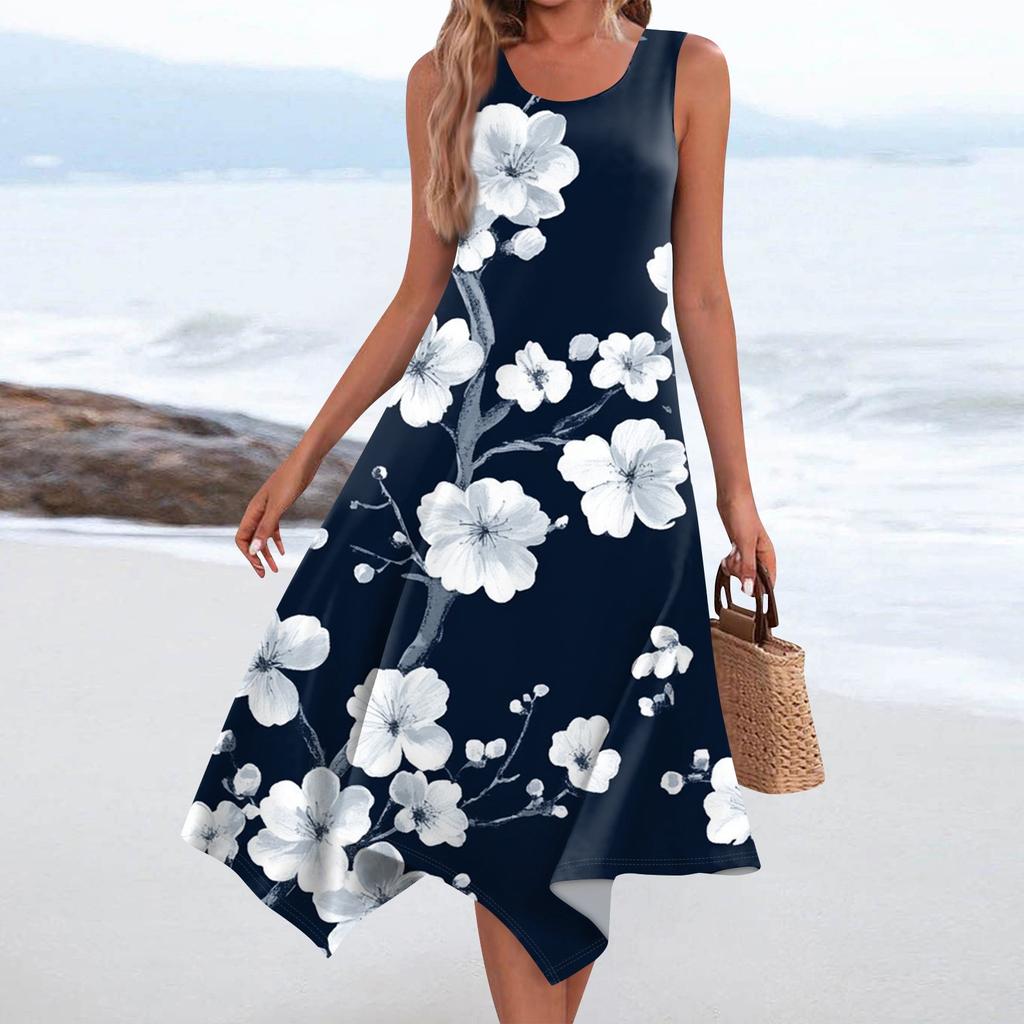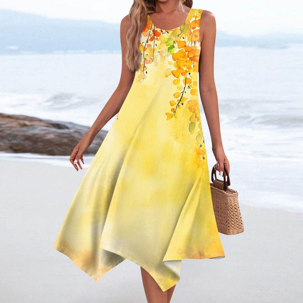Женское повседневное модное платье средней длины с круглым вырезом без рукавов с винтажным цветочным принтом и неровным подолом