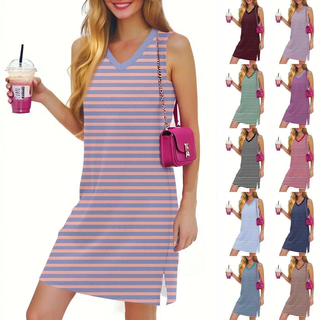 Женское повседневное модное сексуальное платье без рукавов с V-образным вырезом и разрезом по низу в полоску