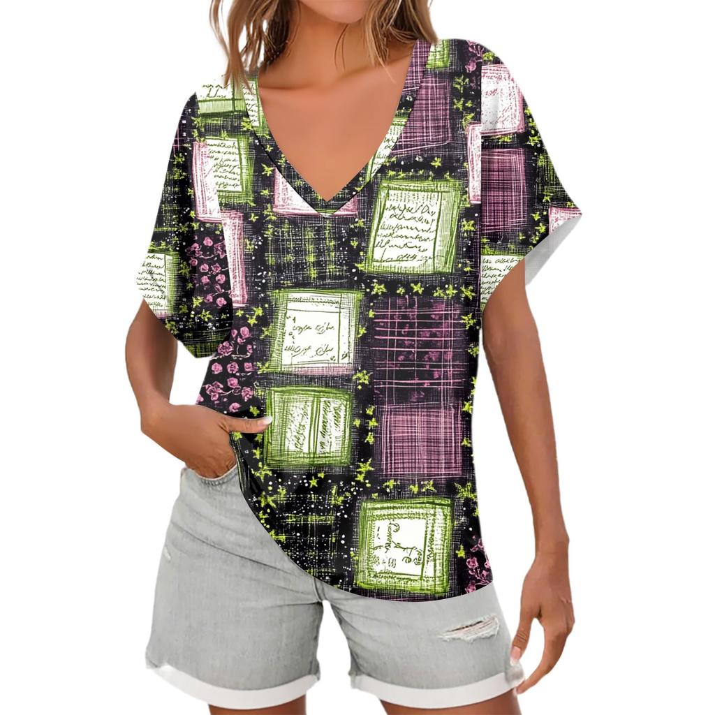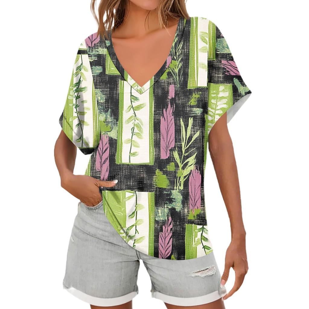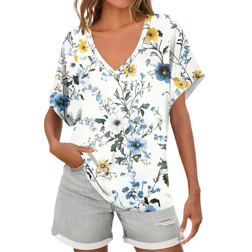 Женские рубашки с коротким рукавом и V-образным вырезом, с цветочным принтом, свободные повседневные футболки, летние топы