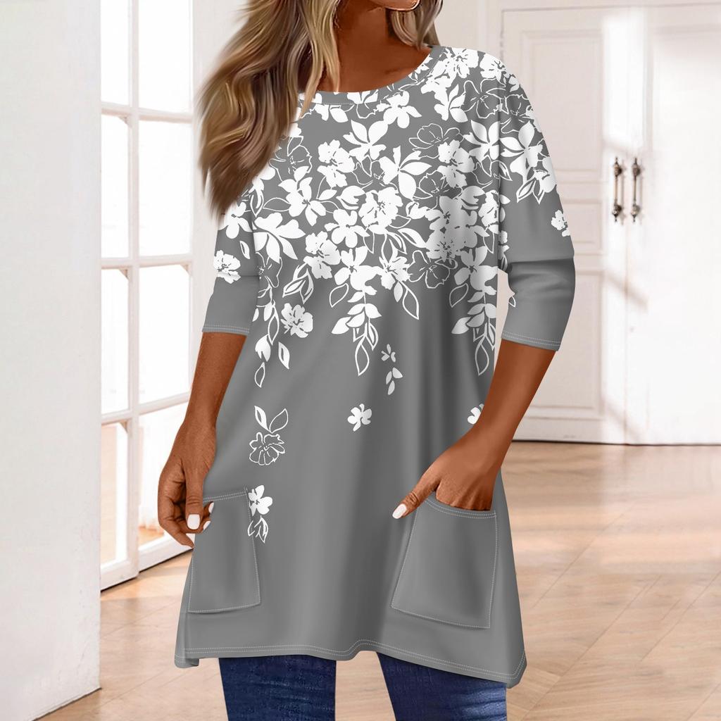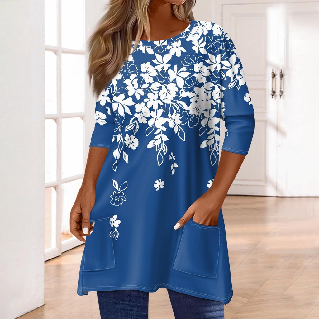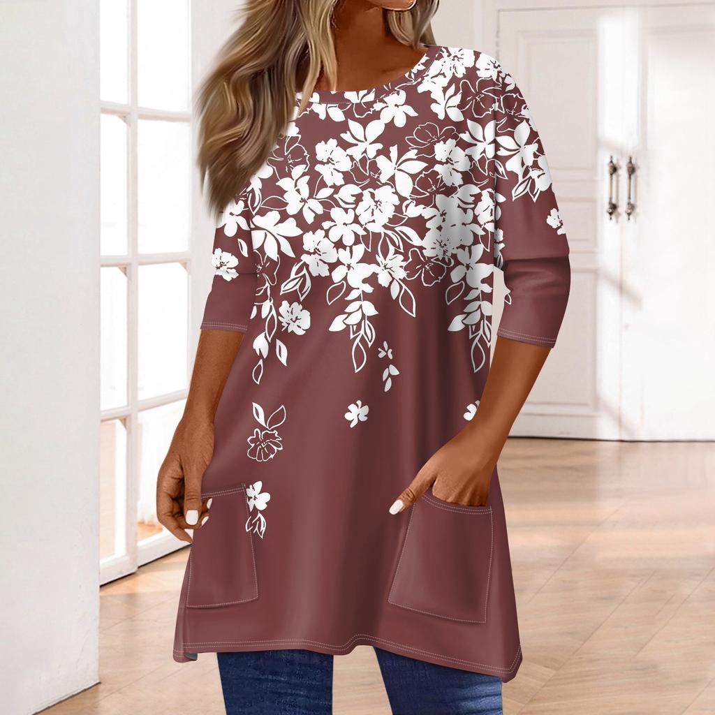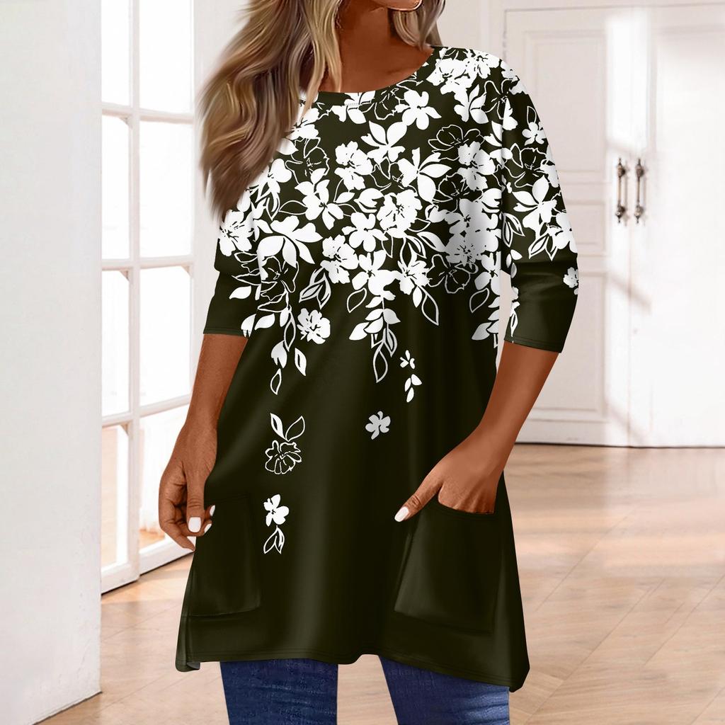 3/4 рукава кармана топы для женщин футболка повседневный принт средней длины топы футболка круглый вырез пуловер блузка
