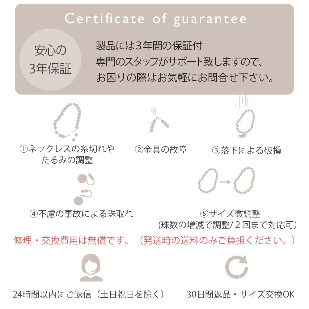 [3-летняя гарантия] Изделия из жемчуга, изготовленные в нашей собственной мастерской, имеют 3-летнюю гарантию, а также мы предлагаем бесплатный ремонт и подгонку размера.. Обмен или возврат по причине некорректных изображений возможен в течение 30 дней с момента получения товара.
