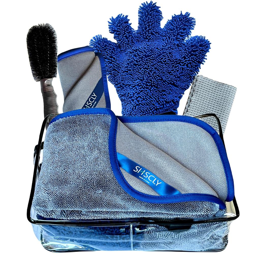 [Содержимое набора] 1 полотенце для вытирания Siskrei (74смx84см, 30смx40см), 1 салфетка из микрофибры, 1 щетка для мытья автомобиля, 1 перчатка для мытья автомобиля, набор из 5 предметов.