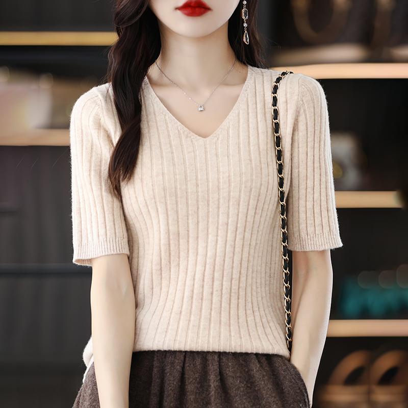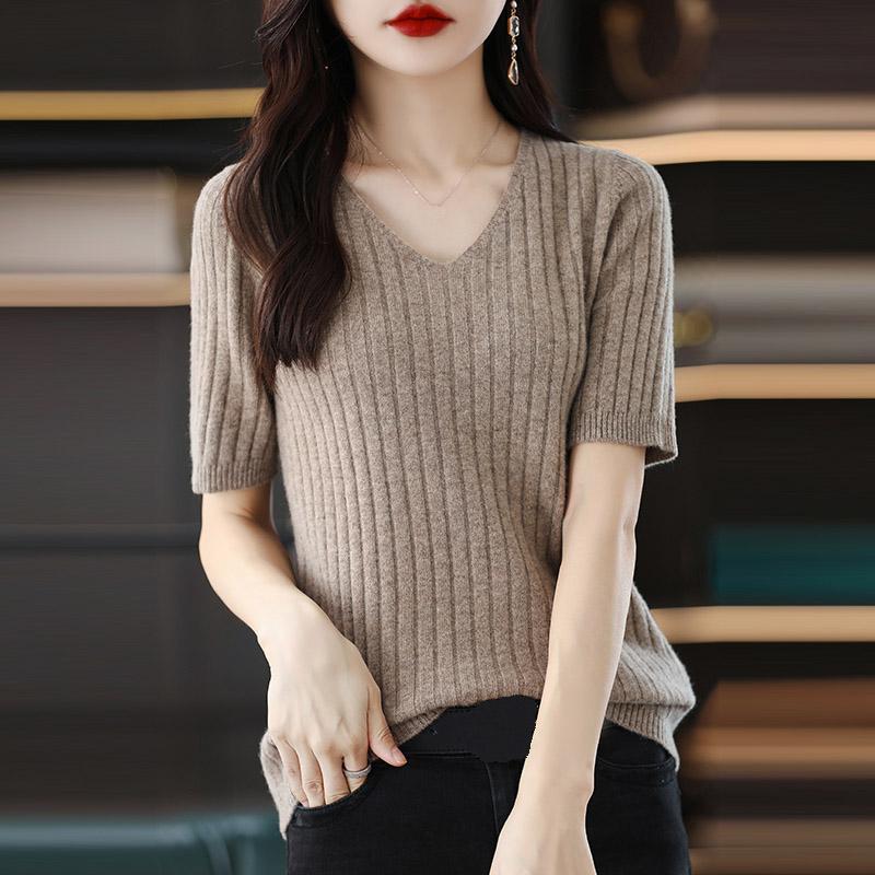 Женские свитера, пуловеры 2025 Лето Короткий рукав V-образный вырез Черный вязаный свитер Женские топы, пуловер JJ303
