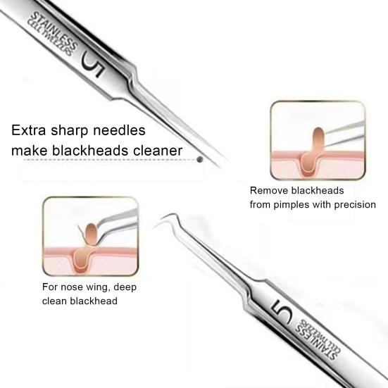 Комплексный набор для удаления черных точек: Наш набор для борьбы с угрями и черными точками предлагает комплексное решение для достижения чистой и здоровой кожи.. В этот набор входят инструменты из нержавеющей стали, предназначенные для эффективного удаления черных точек, белых угрей и прыщей. Он снабдит вас всем необходимым для сияющей кожи.