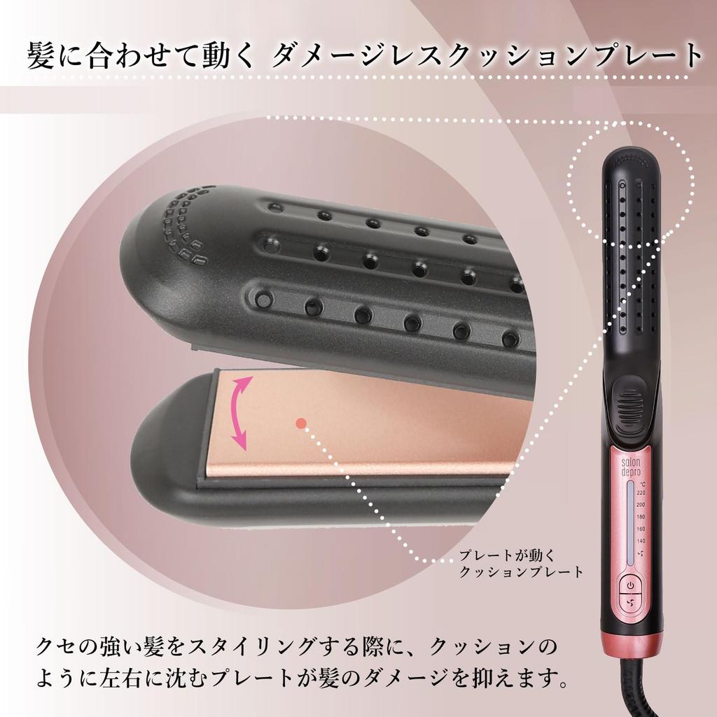 [Безопасно для вьющихся волос] При укладке вьющихся волос необходимо сильно прижимать волосы, но это также может привести к их повреждению.. Salon de pro использует безопасную амортизирующую пластину, которая распределяет силу прижима слева и справа, предотвращая повреждение, что позволяет создавать гибкую укладку, подходящую даже для вьющихся волос.