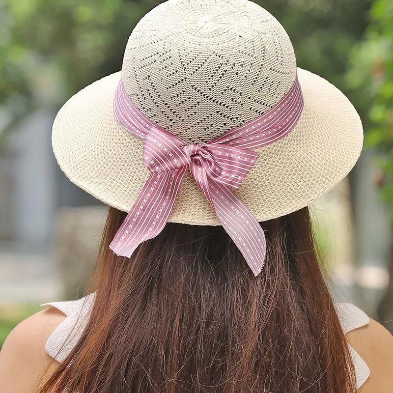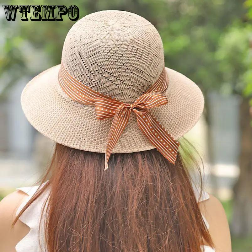 WTEMPO Женские весенне-летние широкополые однотонные солнцезащитные шляпы повседневные дышащие складные пляжные солнцезащитные шляпы с полосатым бантом из ленты