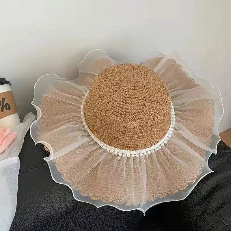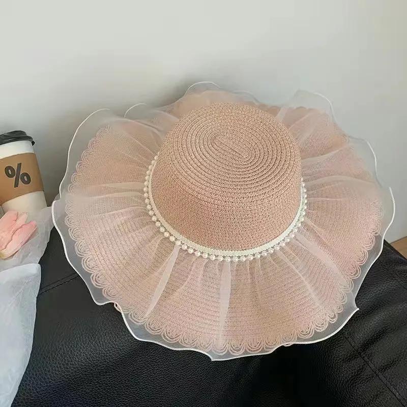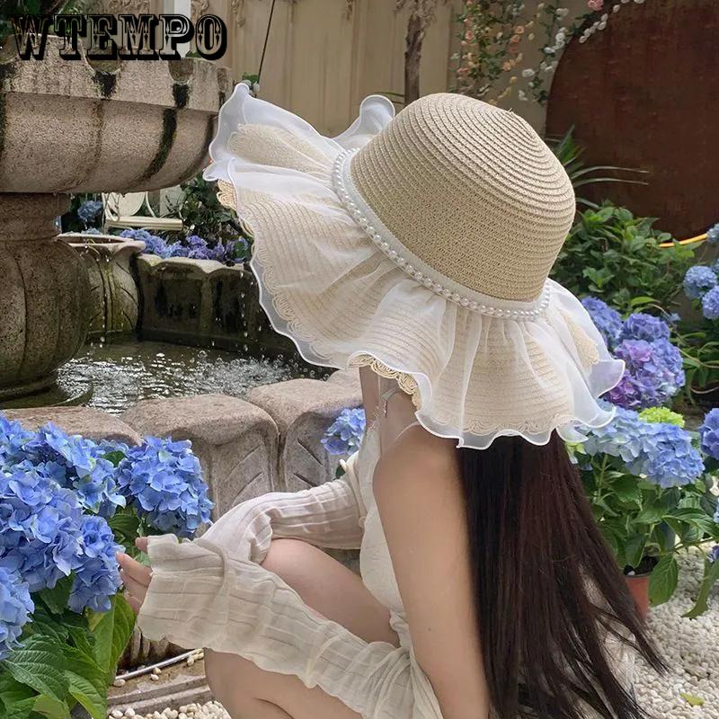WTEMPO Французский стиль, элегантные универсальные кружевные соломенные шляпы с жемчугом, женские летние шляпы с большими полями для пляжа, отдыха, путешествий, солнца