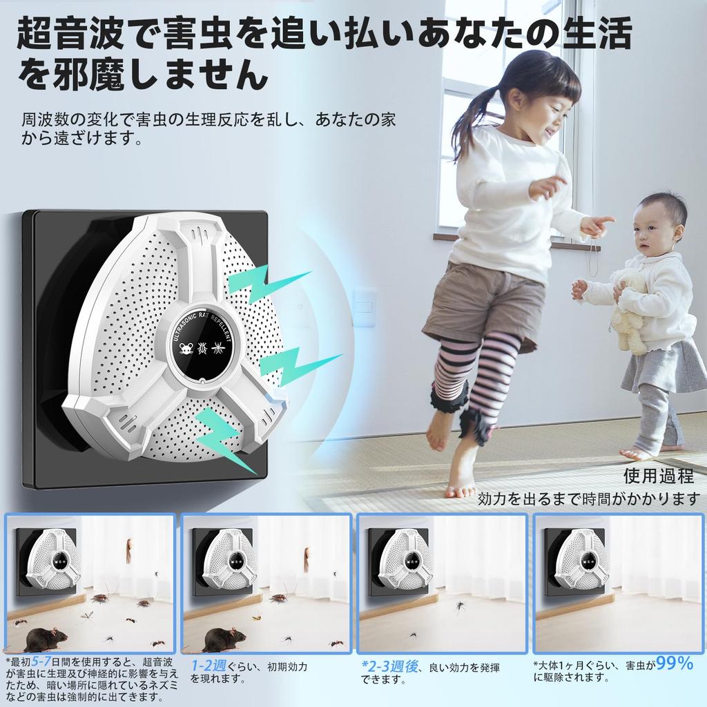 [Эффективный диапазон] Совместимо примерно с 300 татами. Можно использовать в комнатах, кухнях, чердаках, ресторанах, амбарах, складах и т. д.. Ультразвуковые волны безвредны для человека, но если подойти к ним очень близко, можно услышать слабый звук.. Рекомендуется размещать его в неохраняемом месте, например, на верхнем складе.. Для усиления эффекта уничтожения используйте средство непрерывно в течение 24 часов, используйте по одному средству на комнату и размещайте его вместе с химическим средством в местах скопления вредителей.