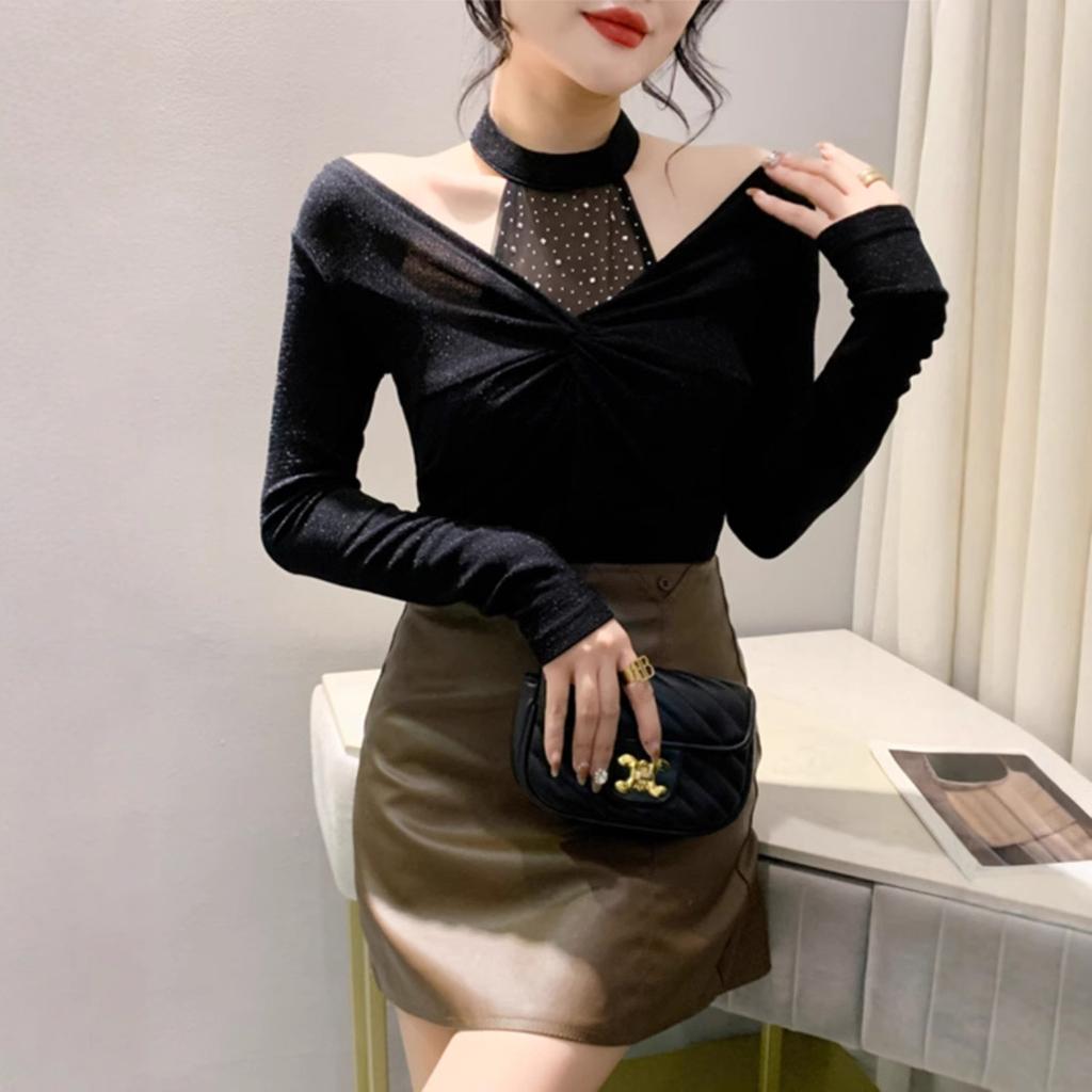 Футболка с открытыми плечами, женская, облегающая, с длинными рукавами, с завязками, с завязками
